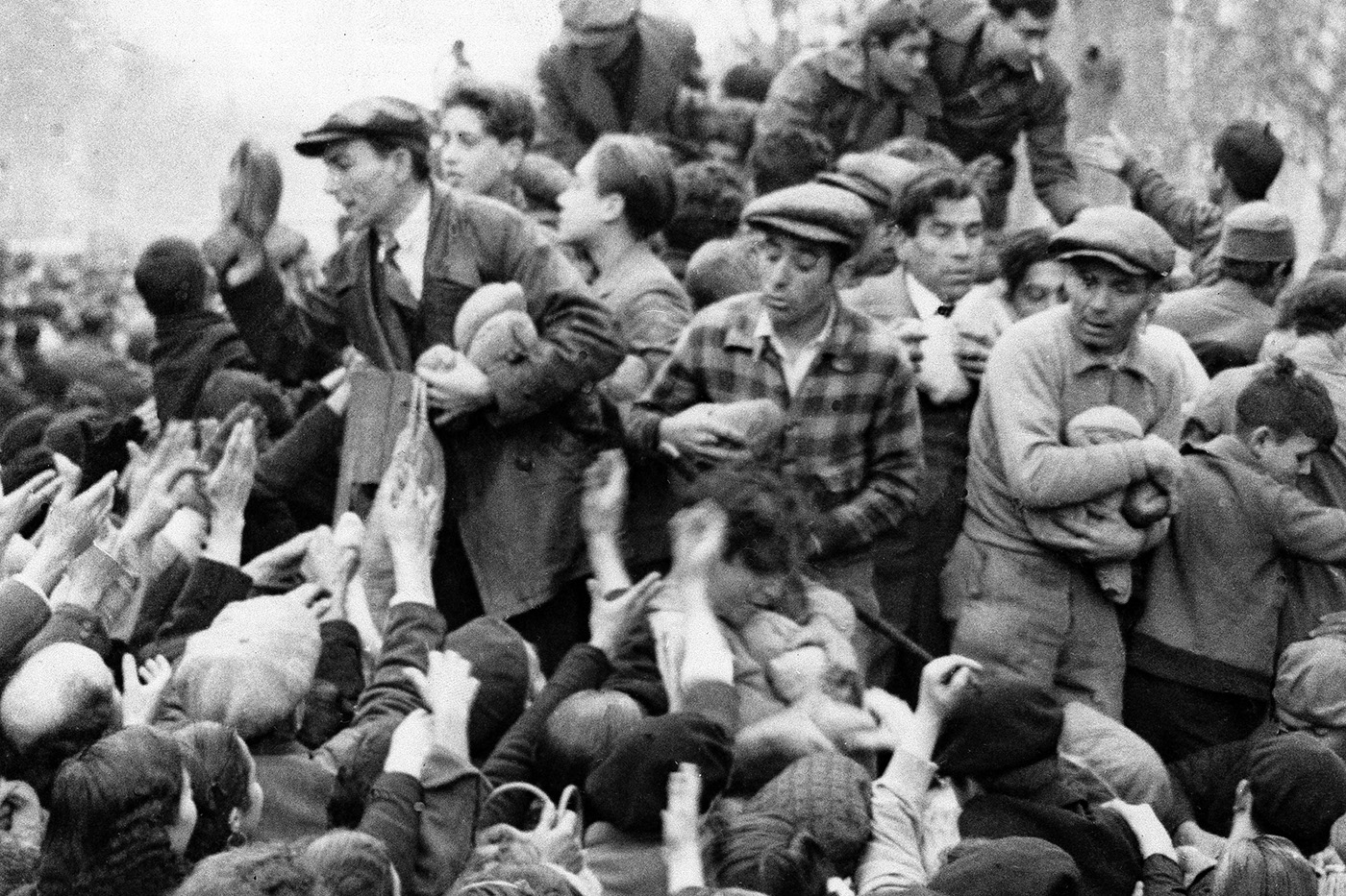 Раздача хлеба голодающим жителям Барселоны после входа в город мятежных войск под командованием генералиссимуса Франсиско Франко. Январь 1939 года.