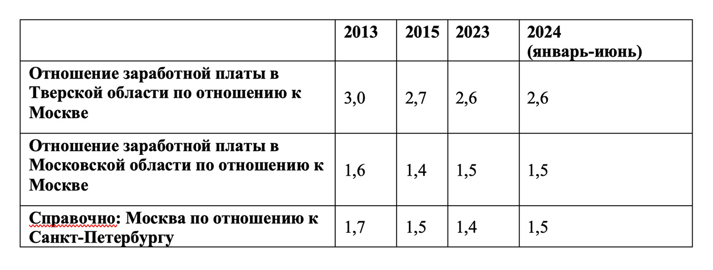 Как видно из представленных данных, региональные различия чрезвычайно устойчивы и на протяжении 10 лет действия «майских указов» практически не меняются: Москва опережает Тверскую область в зарплате бюджетников в два раза, Московскую область — примерно в 1,5 раза. Примерно то же соотношение и у Санкт-Петербурга по отношению к Ленинградской и Псковской областям. Мегаполисы восполняют кадровый дефицит прежде всего за счет граничащих областей, а затем из близлежащих областей соответствующего федерального округа. Московская и Ленинградская области также перетягивают кадры из граничащих с ними областей.