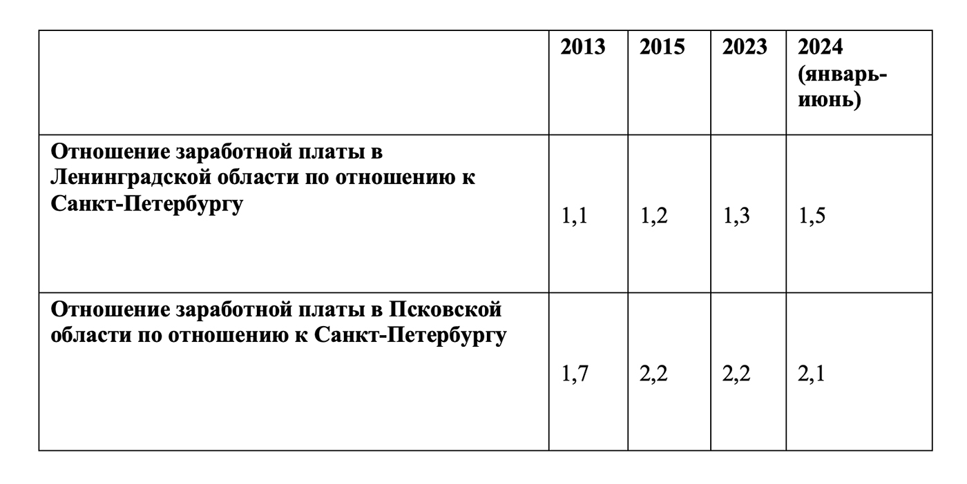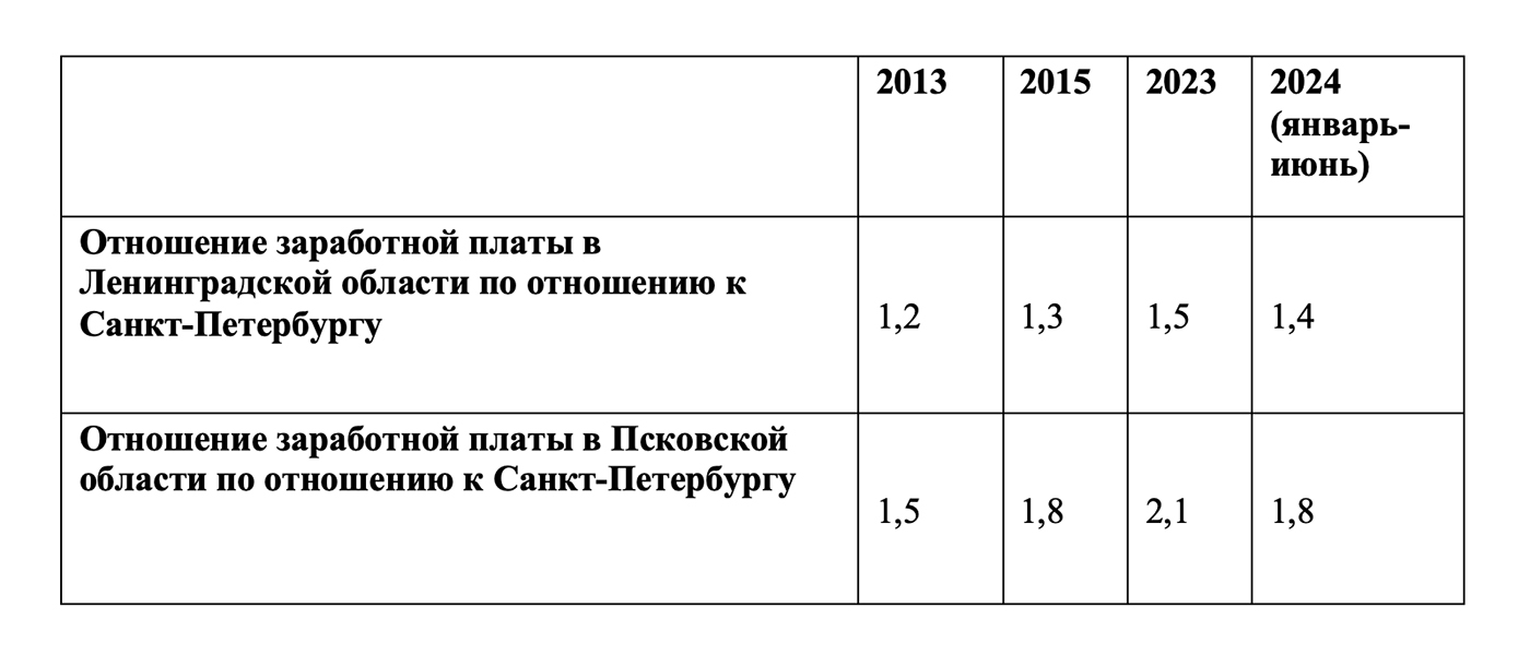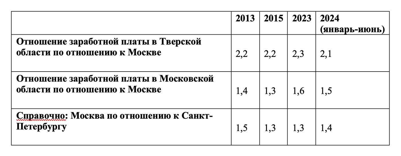 В условиях постоянного дефицита кадров подобное положение привело к межрегиональному перетоку кадров, в особенности в граничащих регионах. В таблицах ниже приведены данные о различиях в заработной плате педагогов общего образования и врачей между Москвой и граничащих областей Московской областью и Тверской областью, и Санкт-Петербургом и граничащими областями: Ленинградской и Псковской.