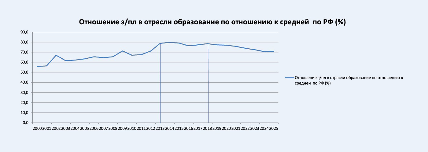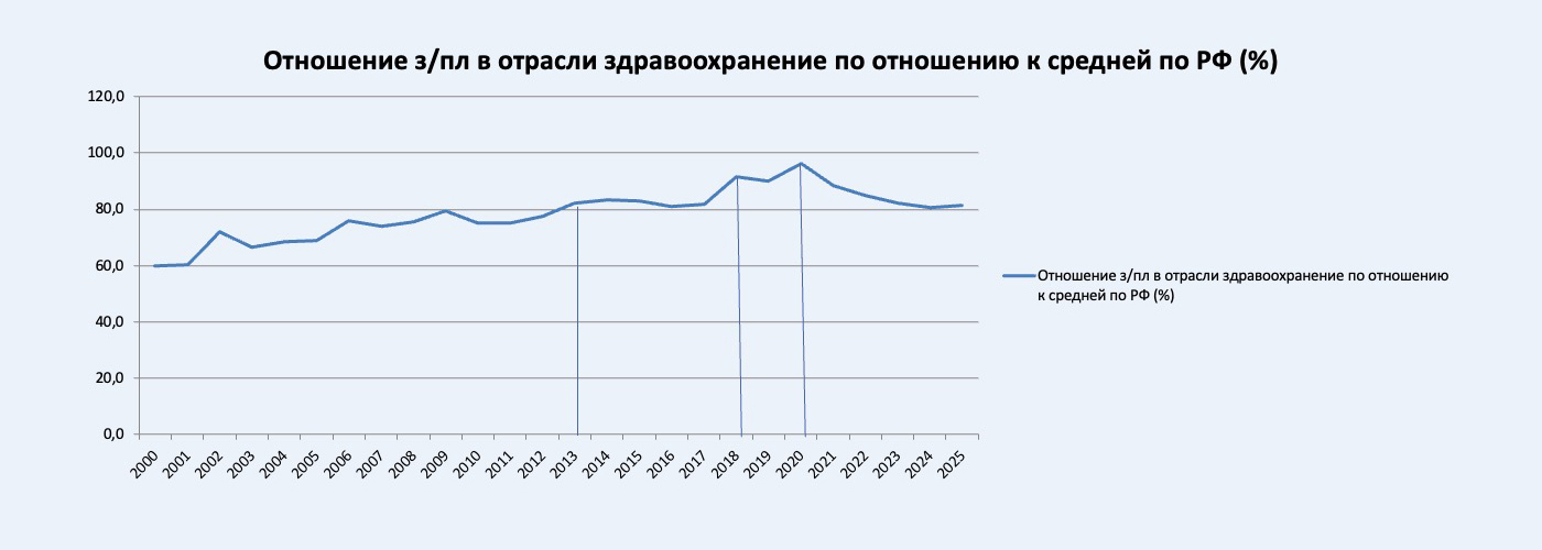 Если проследить динамику соотношения заработной платы в отраслях образования и здравоохранения по отношению к средней по России, то сразу выделяются «пики», то есть периоды, когда происходило наибольшее приближение заработной платы в социальных отраслях к среднему уровню по стране. Для образования и здравоохранения это 2002, 2009, 2013 и 2018 годы.