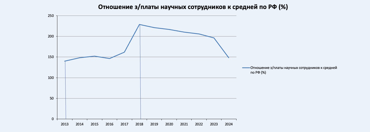 Более благополучная картина в отношении заработной платы научных работников обусловлена частично тем, что большая их часть сосредоточена в Москве, Санкт-Петербурге и иных регионах с более высокой средней заработной платой. Поэтому, даже не дотягивая до двух средних зарплат по своему региону, научные работники в богатых регионах поднимают среднероссийский показатель вверх.