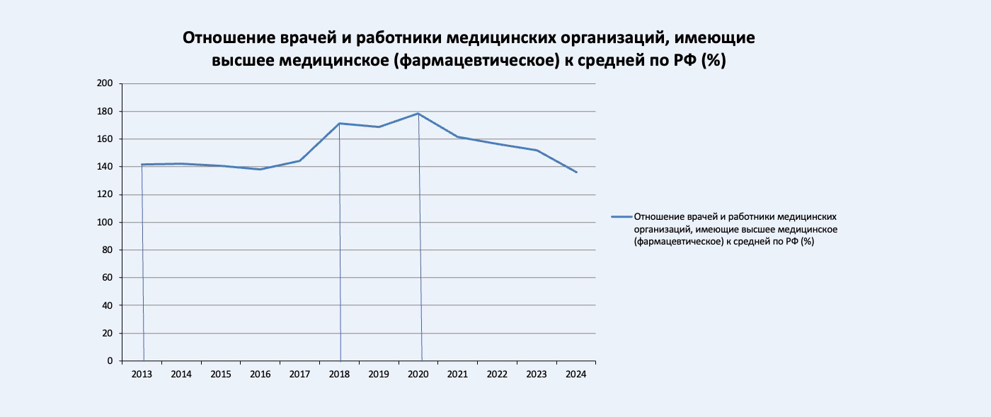 Что касается динамики заработной платы врачей, то очевиден не один пик в 2018 году, а два, и второй приходится на 2020 год. Он связан с эпидемией ковида и соответствующими выплатами медицинским работникам.