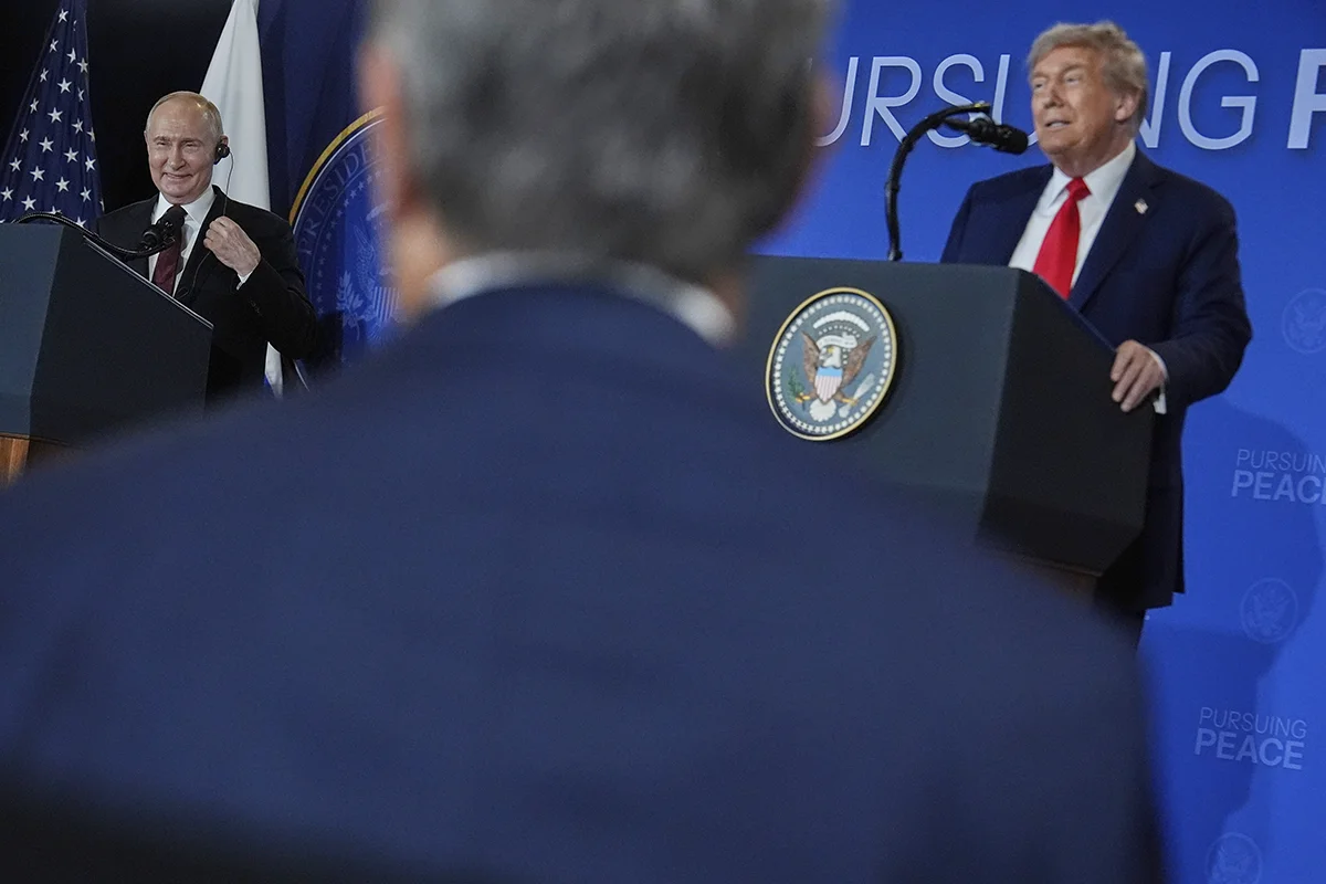 Владимир Путин и Дональд Трамп и выступают на пресс-конференции на объединенной базе Элмендорф-Ричардсон на Аляске. США, 15 августа 2025 года
