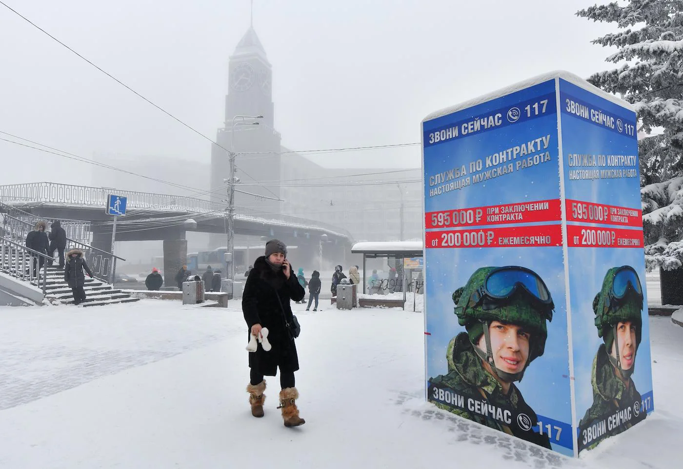 Виды Красноярска. Жанровая фотография. Плакат службы по контракту на Театральной площади. Россия, декабрь 2023 года