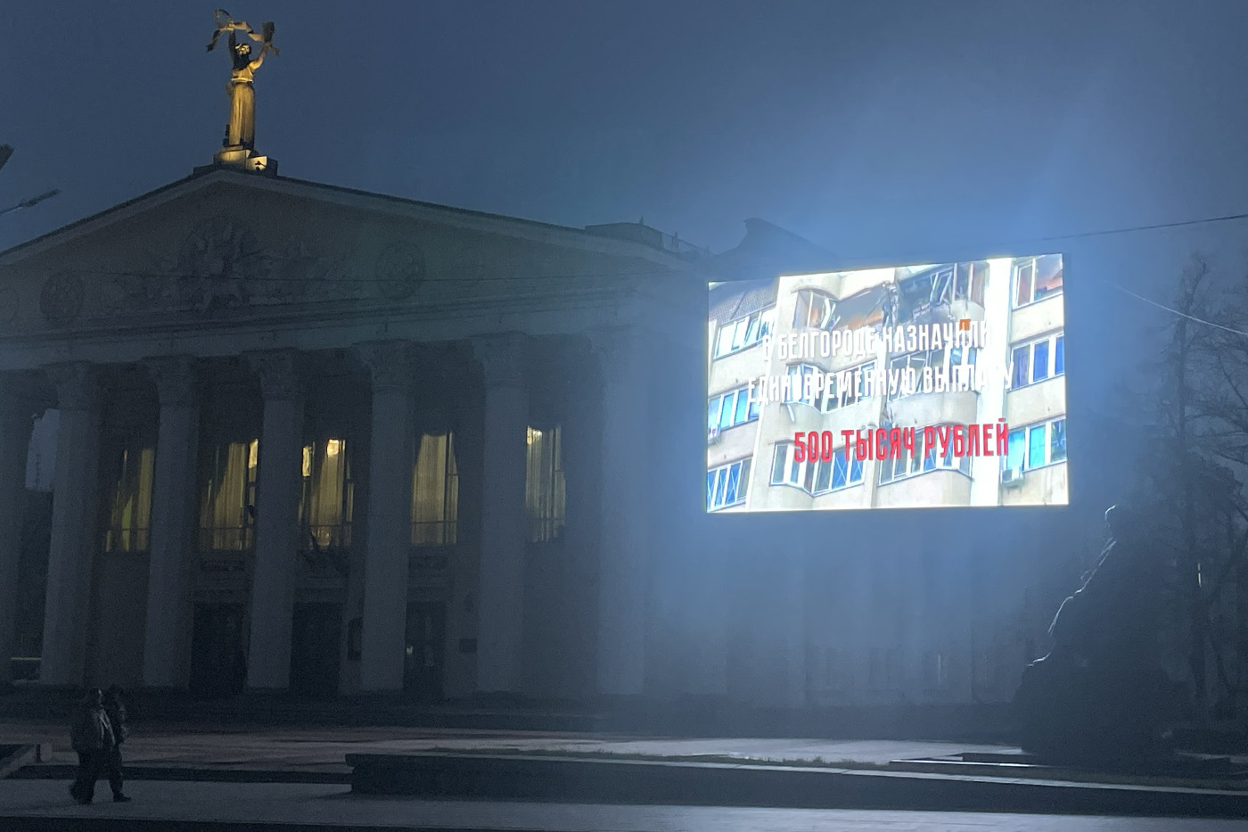 На центральной площади Белгорода установлены два огромных экрана. На них круглосуточно крутят социальную рекламу. Она объясняет, что делать в случае угрозы БПЛА, почему нужно переходить на национальной мессенджер Max, а также — рассказывает, как записаться на контракт. «Они стреляют по мирным — ты можешь им ответить», — говорится в ролике, призванном сподвигнуть белгородцев пойти на военную службу.