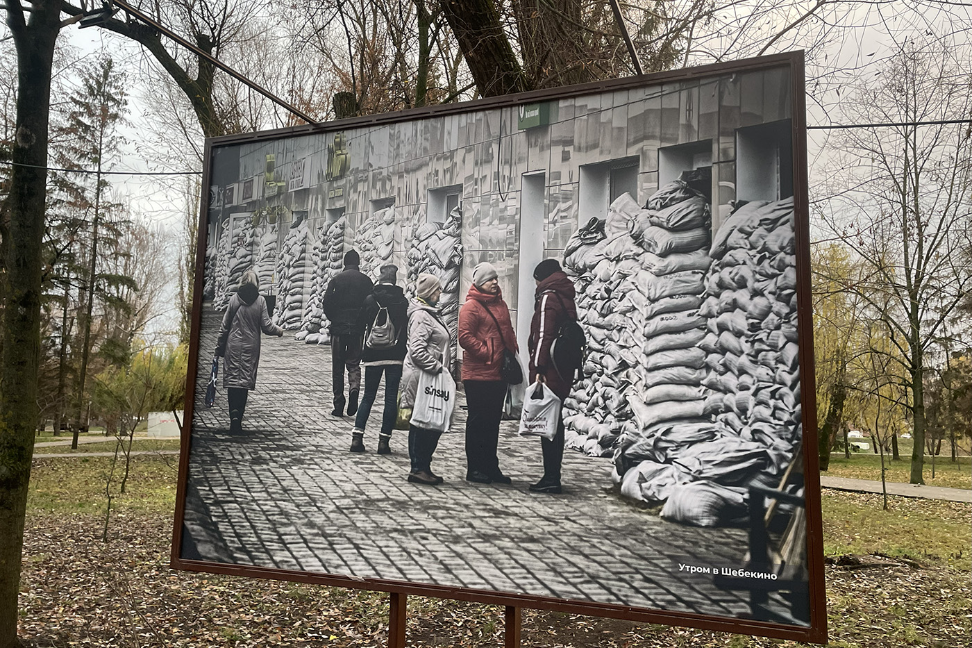 Сразу за площадью и драмтеатром — простирается городской парк. Проходя мимо двух бункеров, сразу же попадаешь на аллею с картинами, нарисованными в рамках проекта «Малая Родина». На одной из них изображена девочка с собакой на фоне превращенного в руины дома, надпись при этом гласит: «Белгород не сдается».