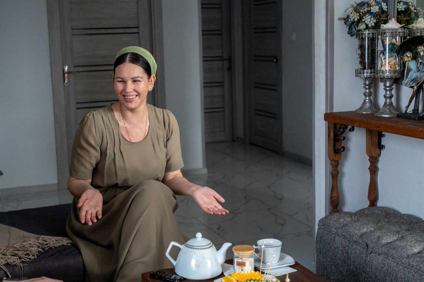 Подходящий дом все же нашли, сделали внутри ремонт своими силами, врезались в ближайший колодец, пока не выкопали собственную скважину. Теперь на полу лежит крупная плитка под мрамор, стены чисто выбелены, на них — зеркала в современных резных рамах, стоит стильная мебель из темного дерева. Кухонный гарнитур — на зависть любой хозяйке, все в спокойных серо-коричневых тонах. На столе — три красных розы под полочкой с распятием и двумя образами. Агафья угощает гостей канапе с тофу и помидорами черри и фруктами, потчует чаем: на «гостевых» чайных парах и ложечках стоят едва заметные точки — старообрядцы не едят из одной посуды с мирянами.