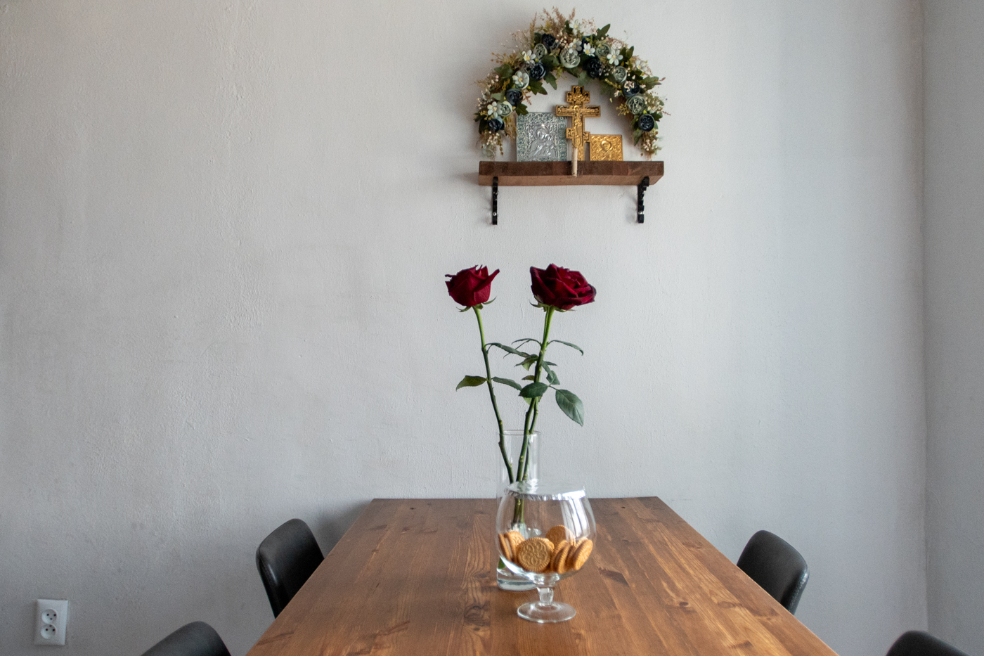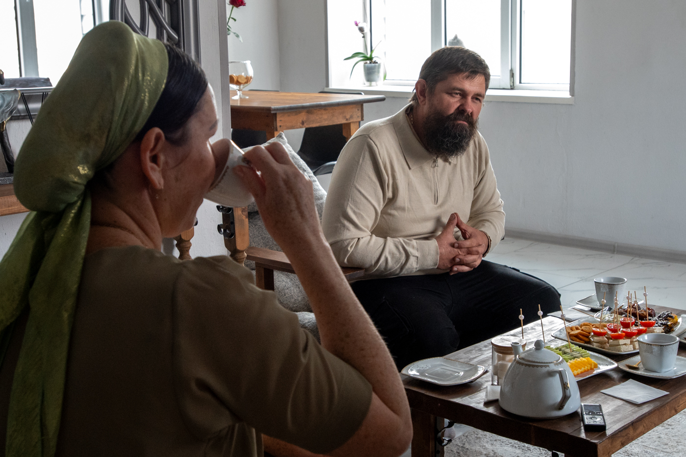 Подходящий дом все же нашли, сделали внутри ремонт своими силами, врезались в ближайший колодец, пока не выкопали собственную скважину. Теперь на полу лежит крупная плитка под мрамор, стены чисто выбелены, на них — зеркала в современных резных рамах, стоит стильная мебель из темного дерева. Кухонный гарнитур — на зависть любой хозяйке, все в спокойных серо-коричневых тонах. На столе — три красных розы под полочкой с распятием и двумя образами. Агафья угощает гостей канапе с тофу и помидорами черри и фруктами, потчует чаем: на «гостевых» чайных парах и ложечках стоят едва заметные точки — старообрядцы не едят из одной посуды с мирянами.