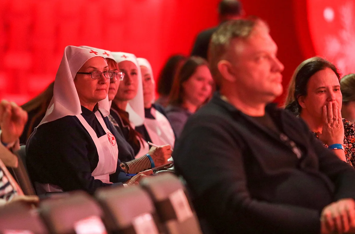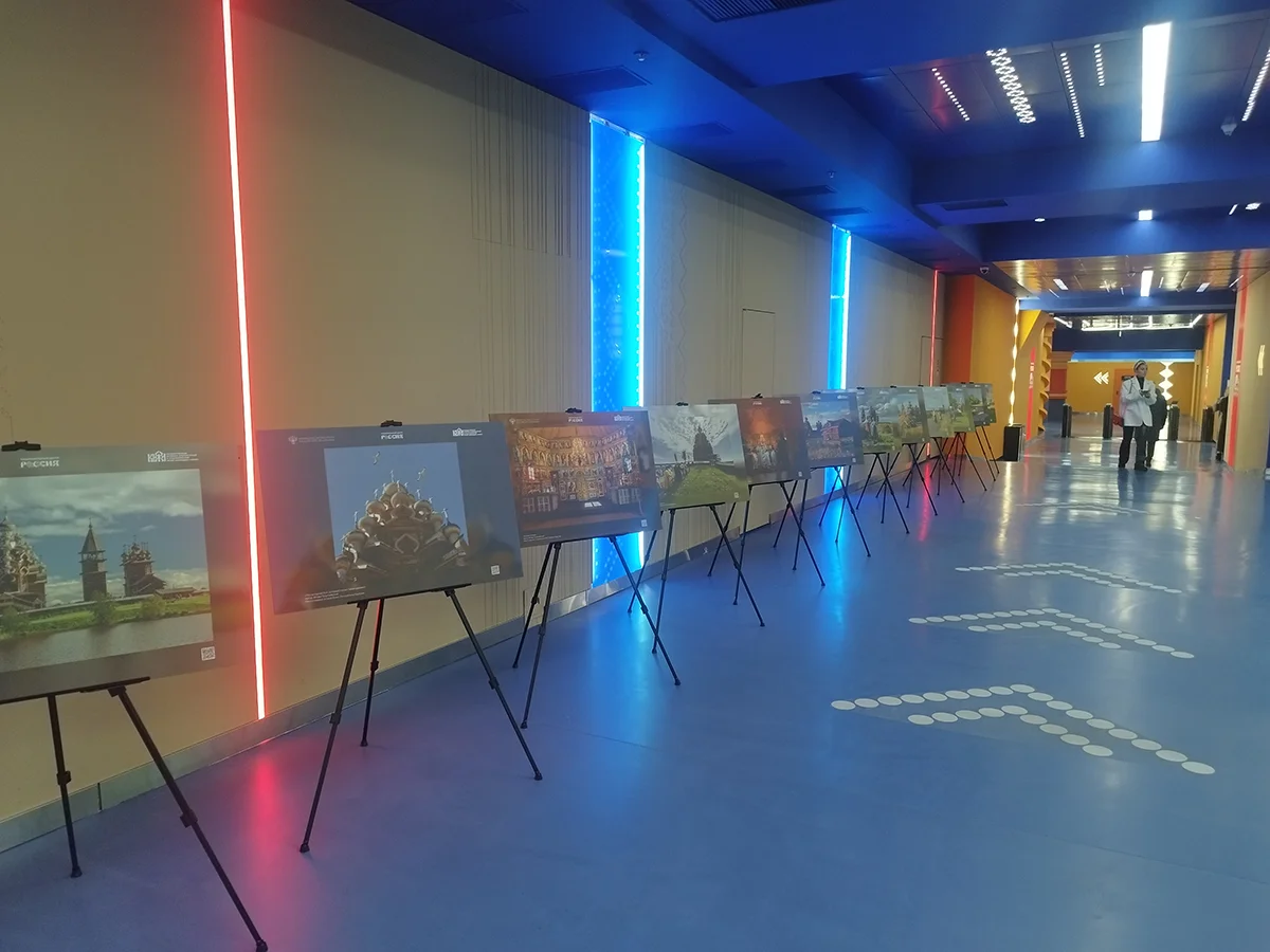 В фойе расположилась выставка фотографий деревянных храмов Кижей и стенд с патриотическим мерчем, увенчанный цитатой Владимира Путина «Для меня Россия — вся моя жизнь». Зал был полон, люди обсуждали последние события, то тут то там звучала фамилия Трамп. Журналисты, пока президиум пустовал, обменивались мнением о мероприятии.