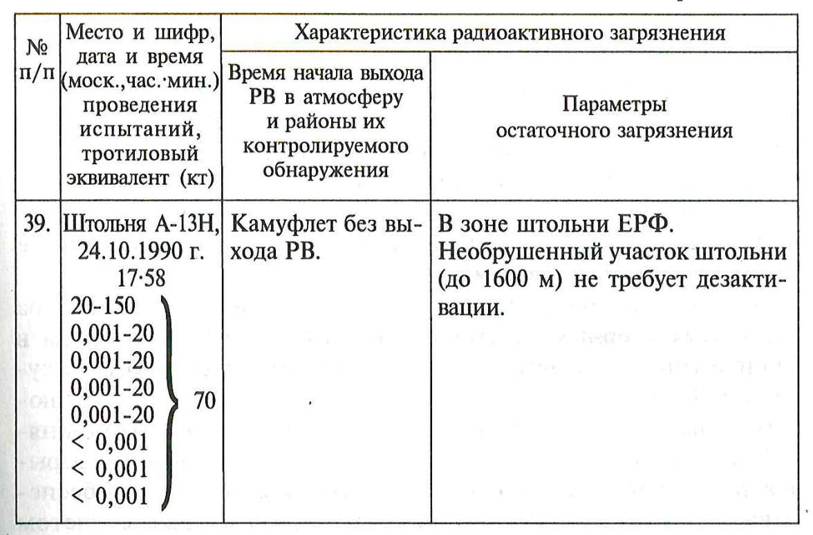Всего было восемь зарядов. Те, что меньше одной тысячной килотонны — это исследовательские, маленькие заряды. С мощностью меньше 0,001 кт — заряды в аварийных режимах, специально проводились опыты, чтобы узнать, как ведет себя заряд в случае отказа какой-нибудь из систем блока автоматики, какую он мощность выдаст? Просто ликвидируется или будет какое-то энерговыделение? Эквивалентная суммарная мощность группового этого подрыва была зафиксирована, как 70 кт. После опыта был проведен экспресс-анализ полученных результатов измерения, а в последующем их повторная обработка. Вся полученная информация передавалась предприятию-разработчику заряда (сейчас это два Российских Федеральных ядерных центра — в Сарове и Снежинске).
