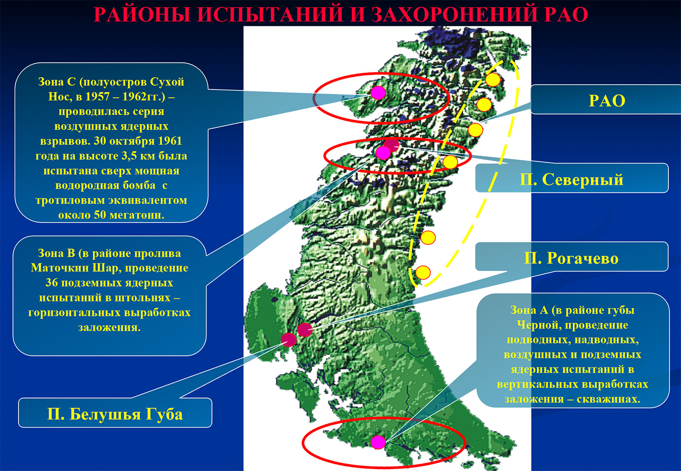 Сам полигон Новая Земля состоит из трех основных поселков на Южном острове. Основной — поселок Белушья Губа, где расположен штаб полигона, основные службы, Рогачёво — авиатехническая база, аэродром, на расстоянии 15 км, и зона подземных испытаний — поселок Северный. Воздушные испытания проводились на Северном острове, губа Митюшиха, мыс Сухой Нос.