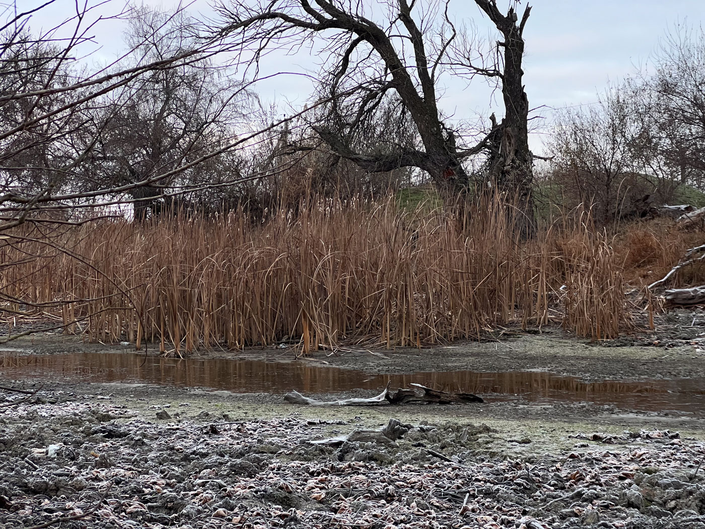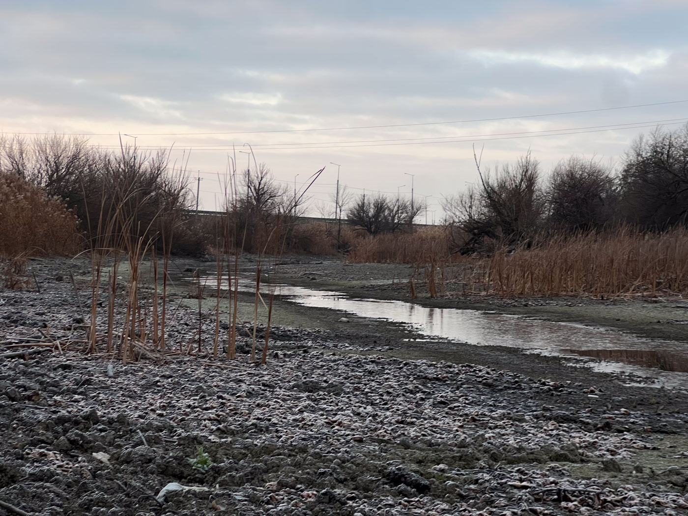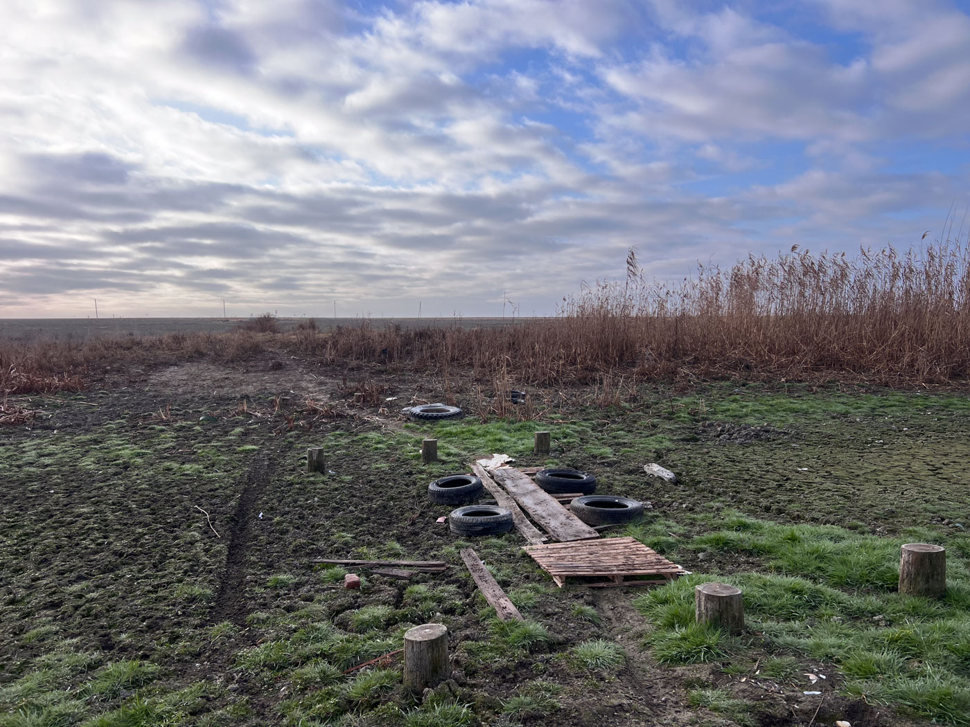 Вскоре Cветлана подходит к пересохшему руслу, на другом берегу тихо шумит камыш. Через Буву накиданы деревянные строительные палеты — местные положили их, чтобы ходить к федеральной трассе. Так короче.