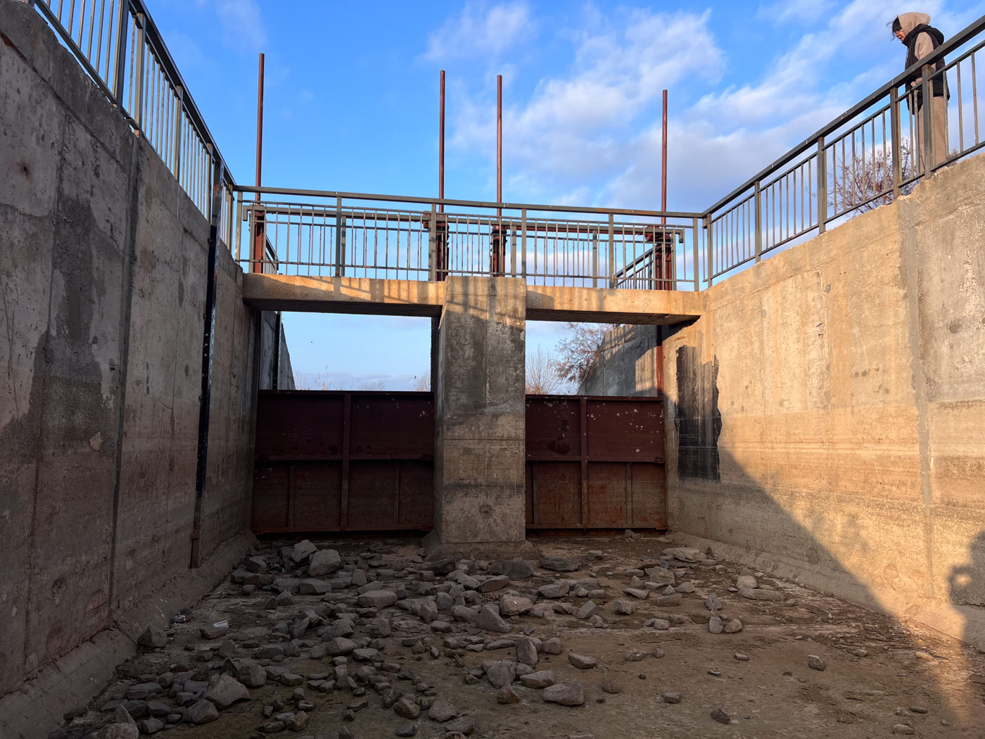 Через полчаса Зифа сворачивает с трассы на грунтовку, поросшую колючкой и репьем. «Сейчас к дамбе сходим», — объясняет она и выходит из машины. Идет куда-то в сторону, в степь. Вскоре из-за кустарника выглядывает железная ограда, за ней — бетонные своды с железными затворами. Небольшая дамба. Если обогнуть ее и спуститься вниз, угадывается русло небольшой протоки. Земля здесь совсем сухая — воды не было уже несколько месяцев.