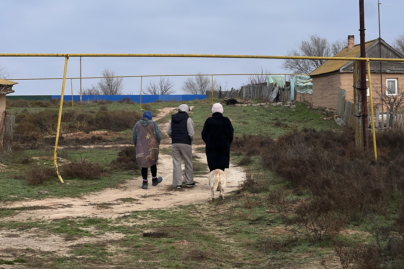Вскоре Cветлана подходит к пересохшему руслу, на другом берегу тихо шумит камыш. Через Буву накиданы деревянные строительные палеты — местные положили их, чтобы ходить к федеральной трассе. Так короче.
