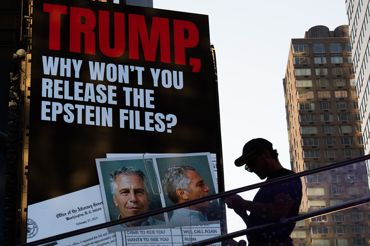 Рекламный щит на Таймс-сквер призывает к публикации «файлов Эпштейна», Нью-Йорк, США