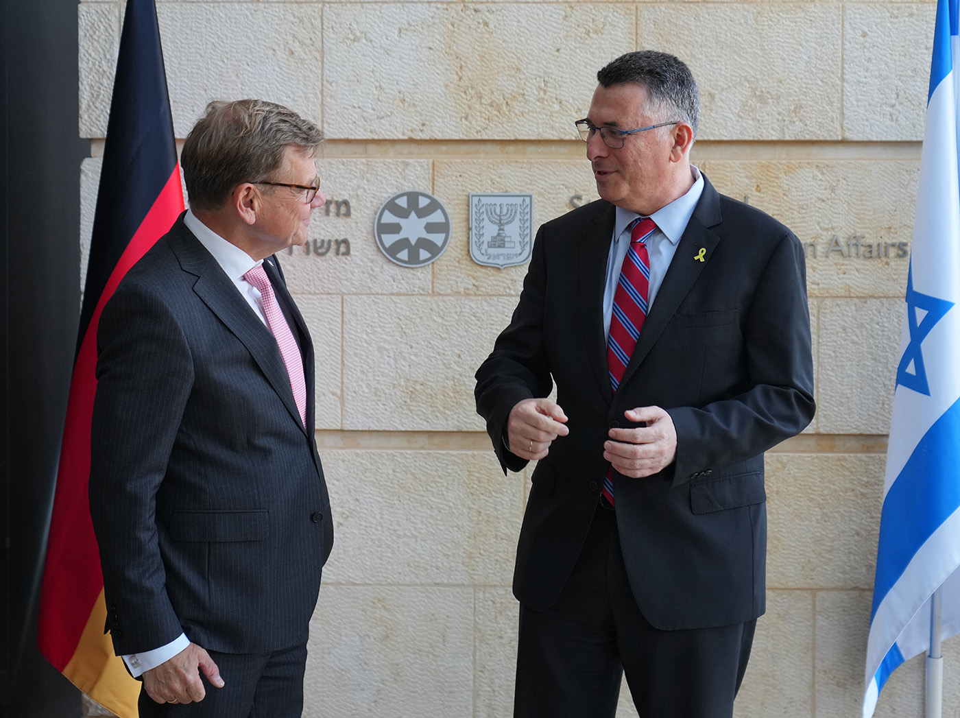 Министр иностранных дел Германии Йохан Вадефуль (слева) и его израильский коллега Гидеон Саар приветствуют друг друга перед их двусторонней встречей.