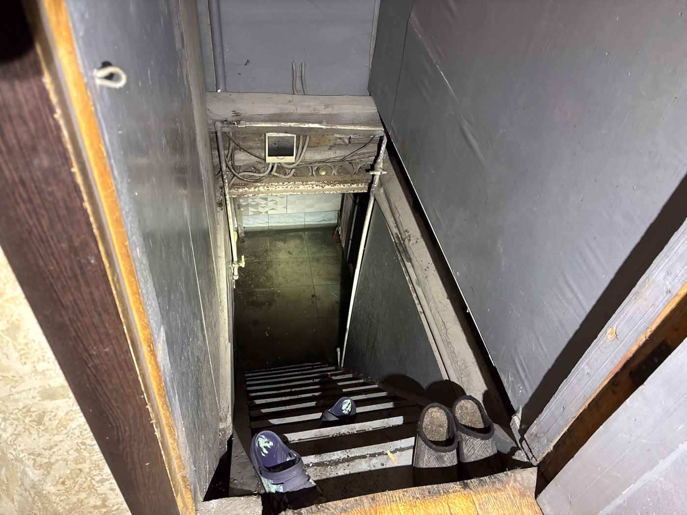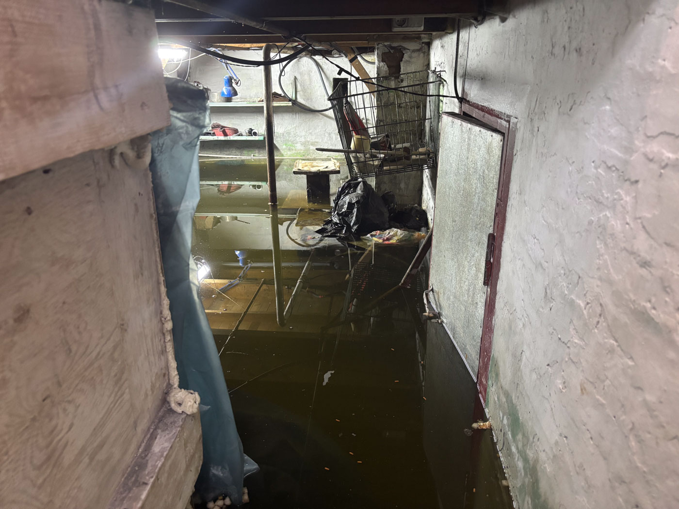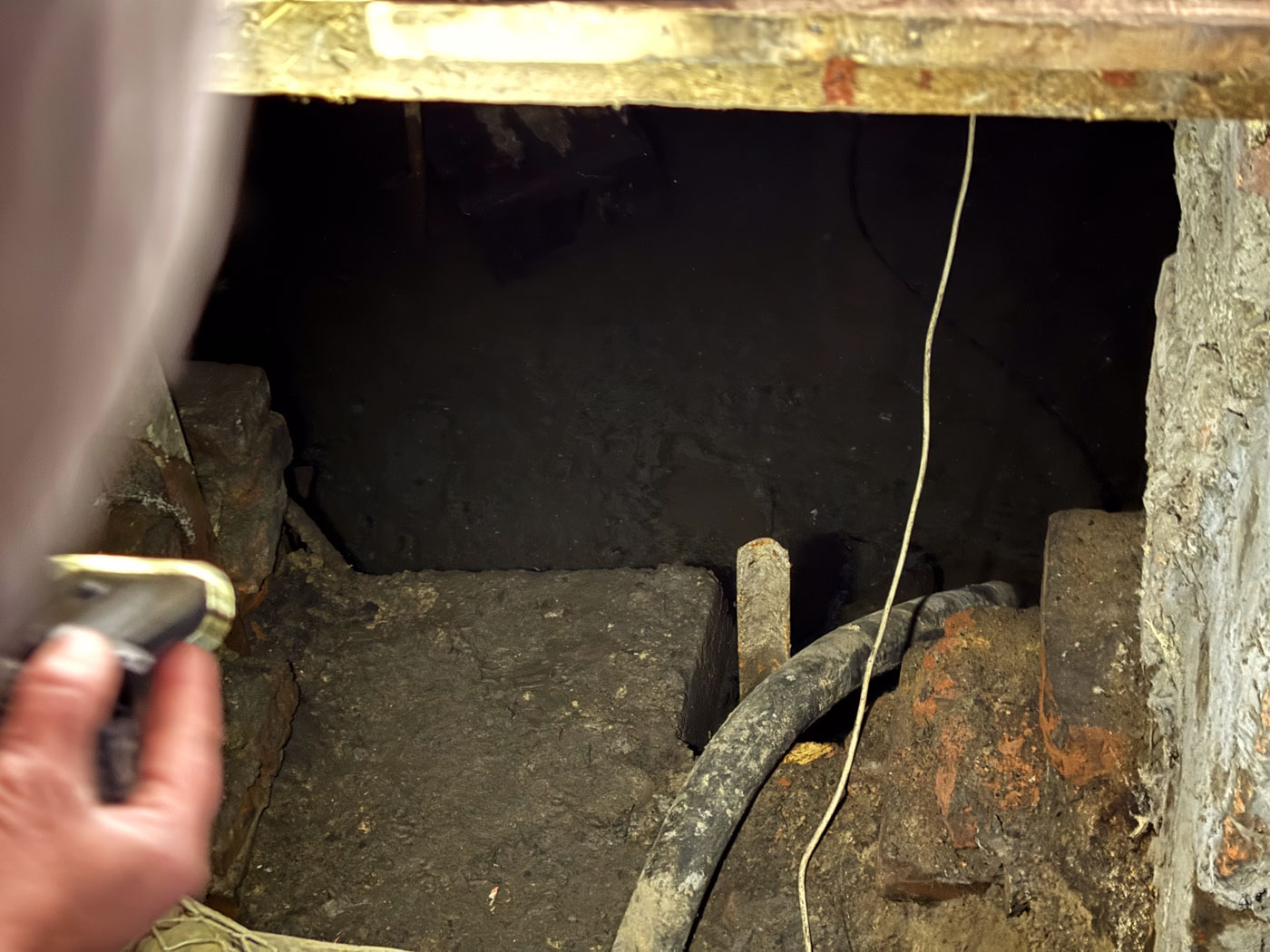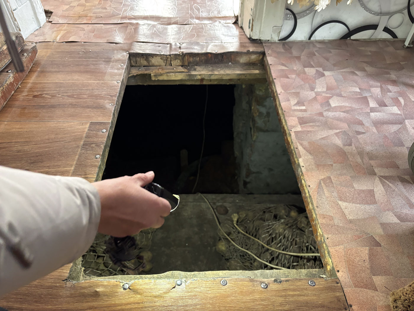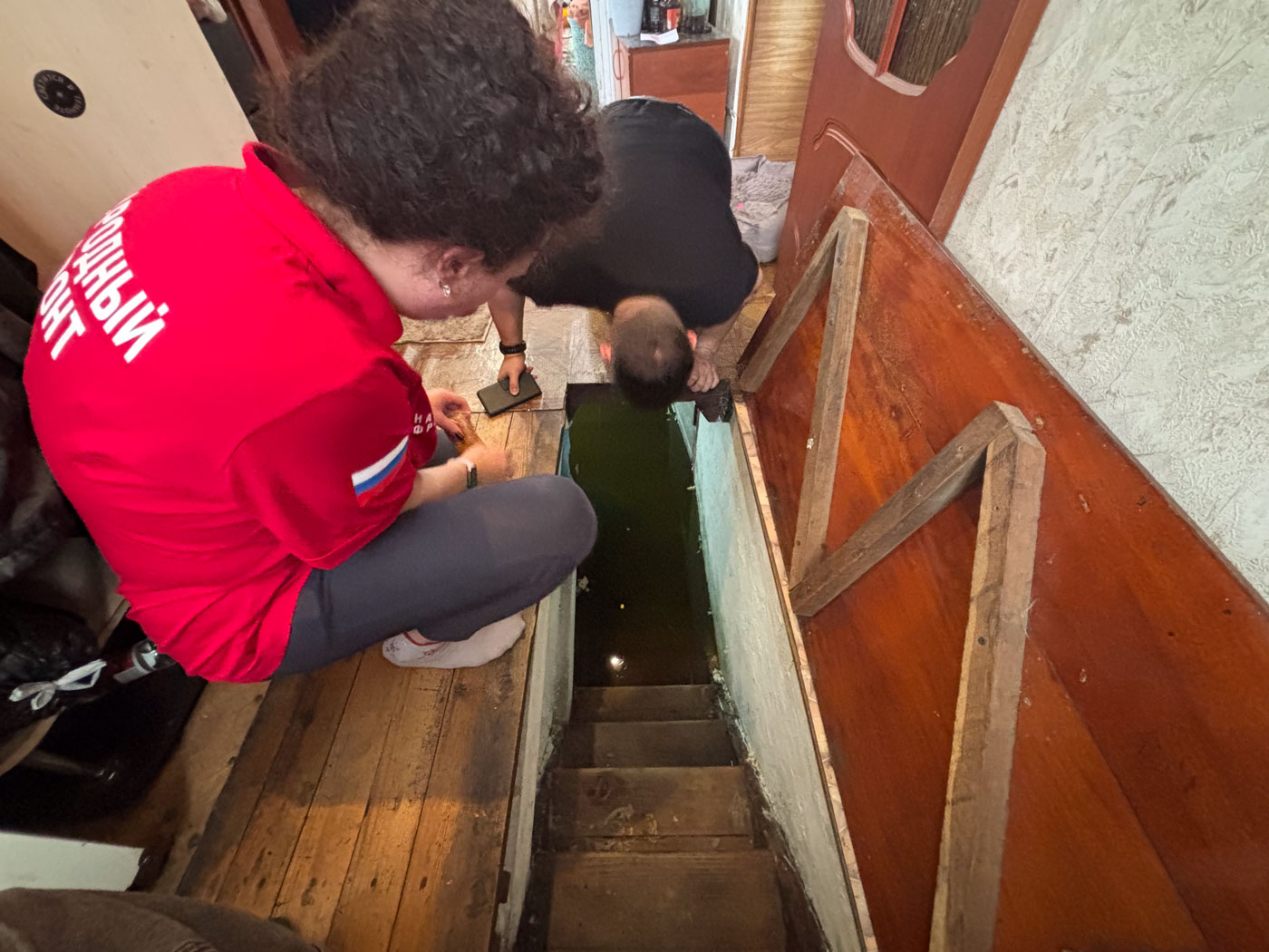 Сначала Юрий показывает затопленный подвал и углярку (помещение, где хранят уголь — прим. ред.), в комнате с печью вода стоит выше щиколотки, так что в коротких резиновых сапогах ступать приходится аккуратно, чтобы не зачерпнуть через край. Юрий в высоких сапогах шагает смелее, опускает строительный уровень в воду, чтобы показать — в следующем помещении воды больше, чем на метр в глубину: уровень погружается полностью и так и не достает до пола.