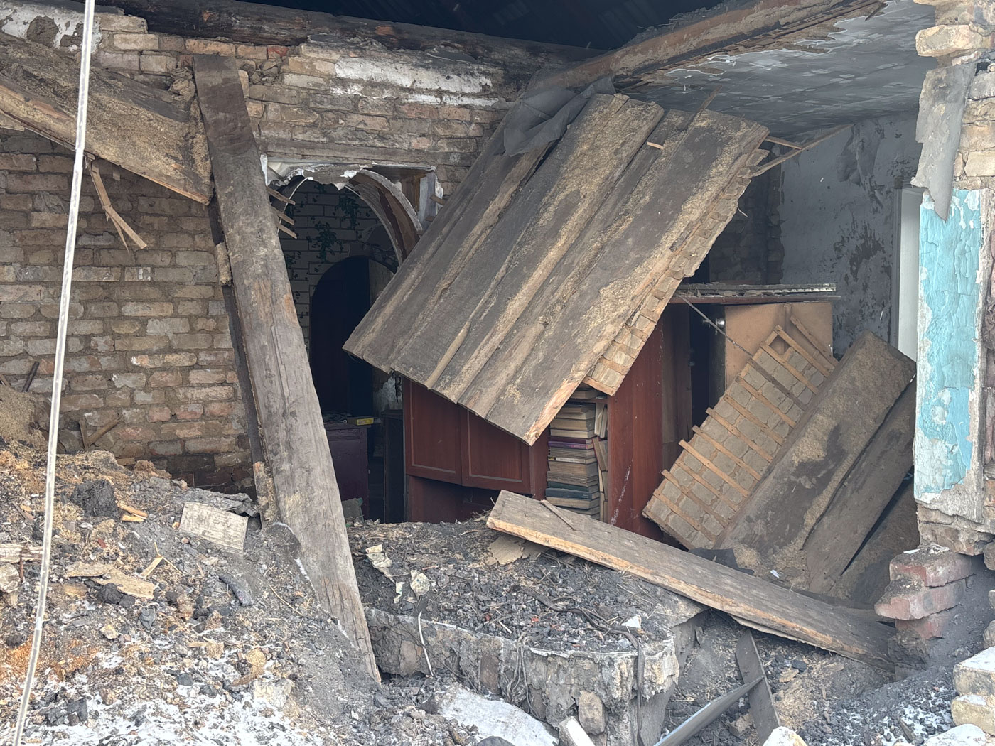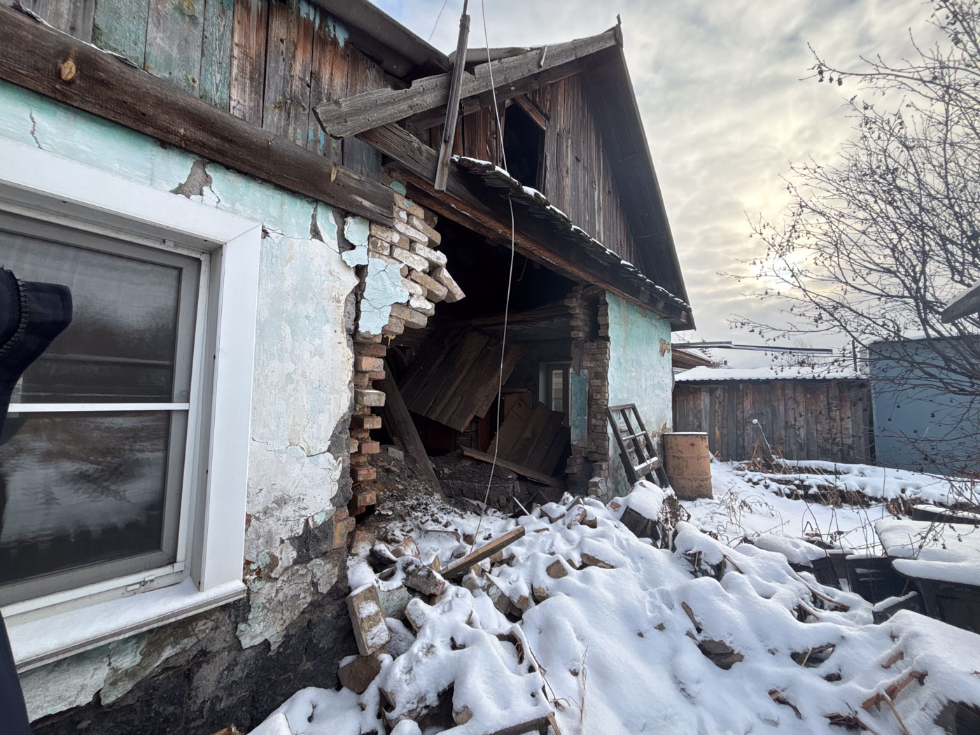 Сергей, владелец рухнувшего ипотечного дома, уже сейчас не может получить страховку: дом признали аварийным и непригодным для проживания. Калитка здесь завязана толстым шнурком, сам дом закрывать смысла уже нет — с обратной стороны от забора вместо стены зияет провал, через который видна внутренняя обстановка: обои, книжный шкаф под руинами перекрытий, покосившаяся кирпичная кладка. Все это уже припорошило свежим снегом.