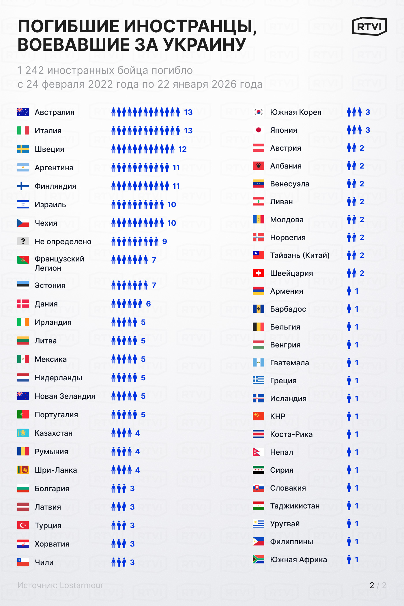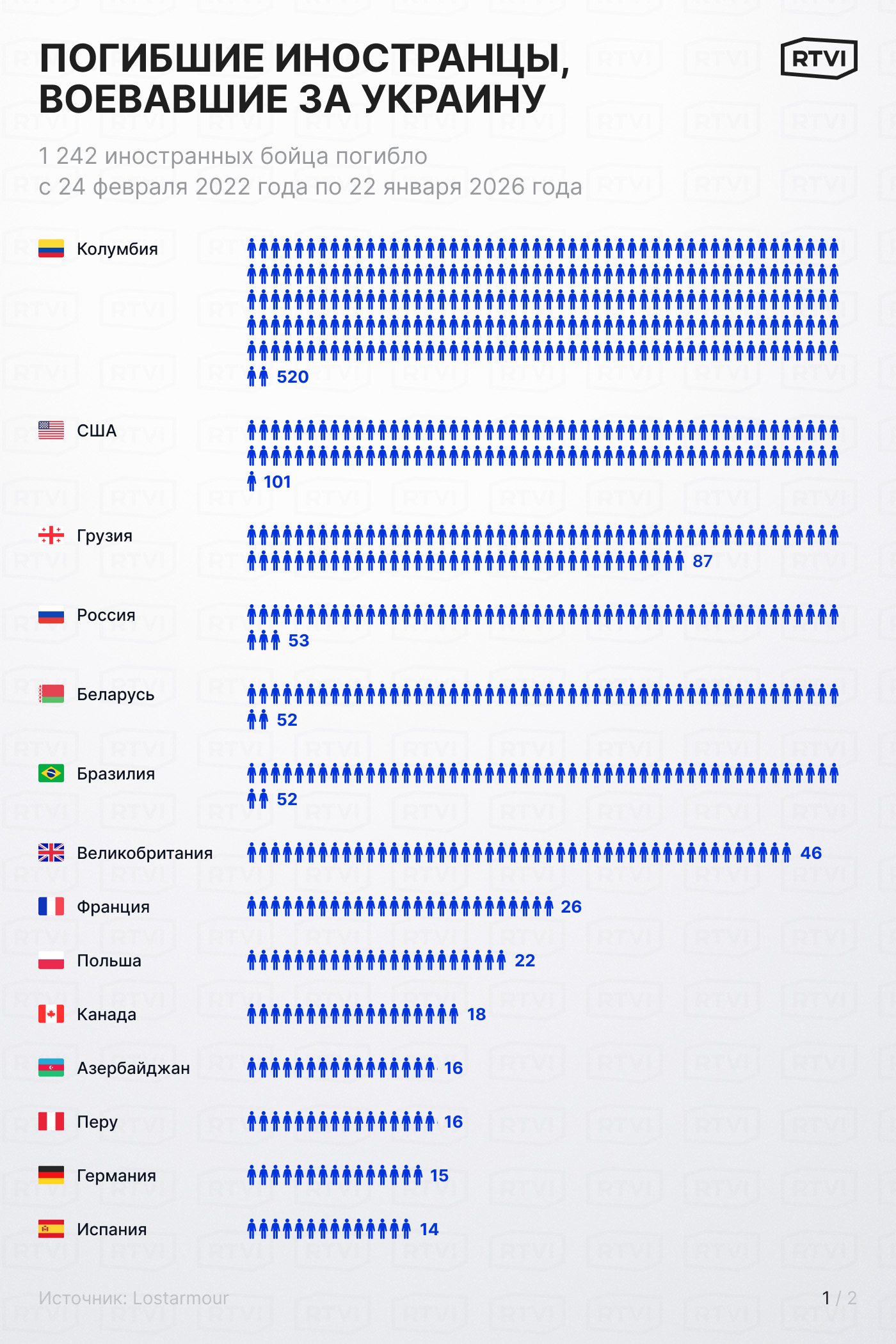 Судя по статистике OSINT-проекта Lostarmour, бразильцы более везучие бойцы — к концу января 2026 года погибло 520 военнослужащих с паспортом Колумбии и только 52 Бразилии. Как рассказал RTVI один из админов проекта TrackANaziMerc, летом 2025 года в ВСУ было привлечено около двух тысяч граждан Колумбии.