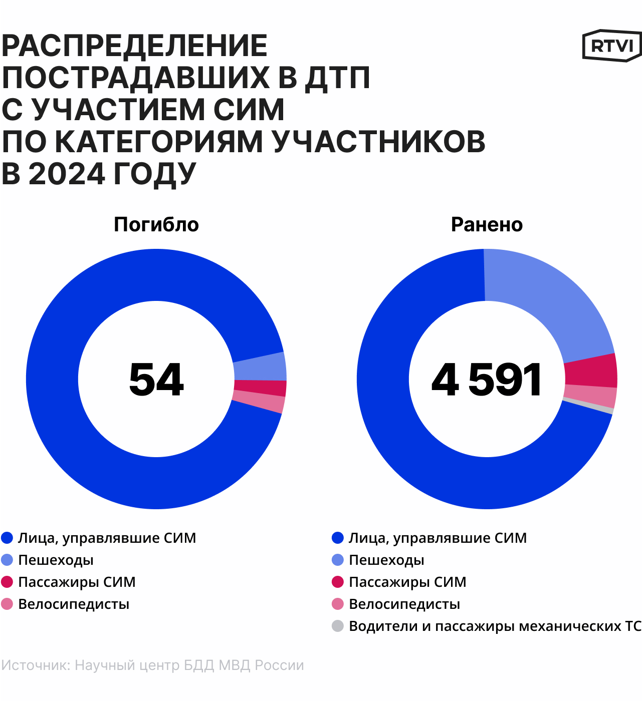 Травмируются также чаще сами СИМоводы (70,5% в 2024 году), чем пешеходы (22,3%) и прочие участники движения.