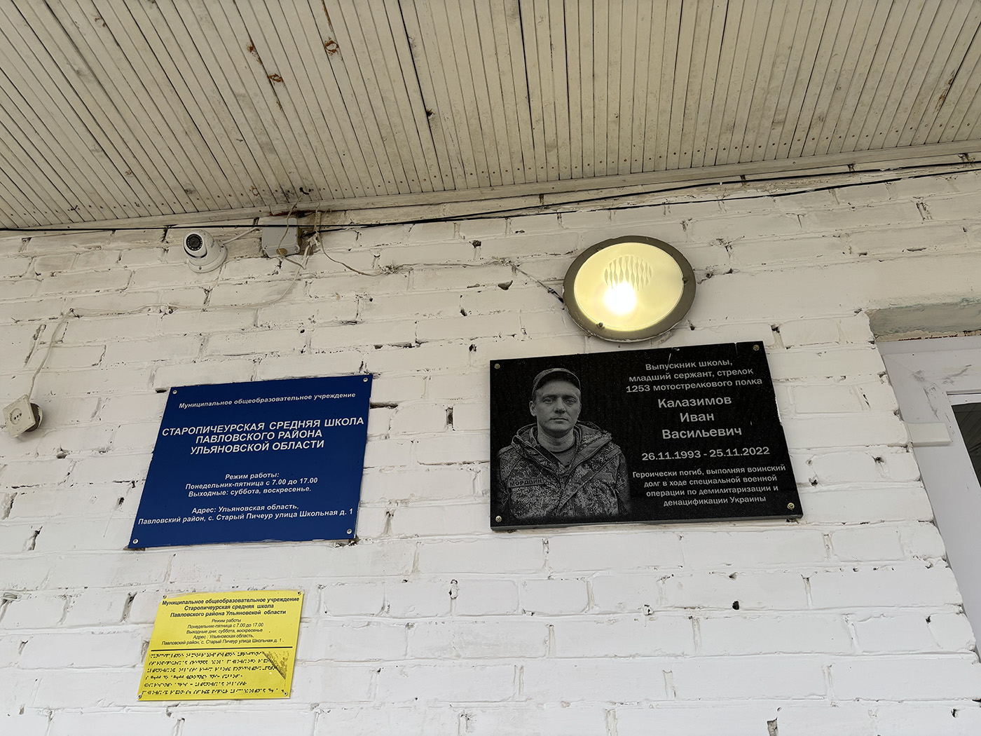 На входе в Старопичеурскую школу висит мемориальная доска: Иван Калазимов погиб на СВО в конце ноября 2022 года — первым из выпускников. Его дочь тоже учится в этой школе, рассказывает Екатерина Калазимова, жена Ивана.