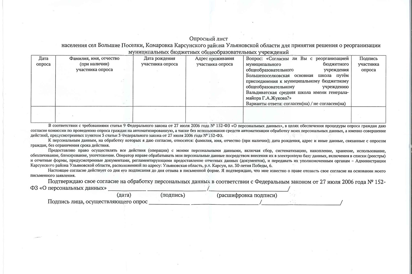 “Согласны ли вы с реорганизацией Большепоселковой основной школы путем присоединения к Вальдиватской средней школе имени генерала-майора Г. А. Жукова?”.