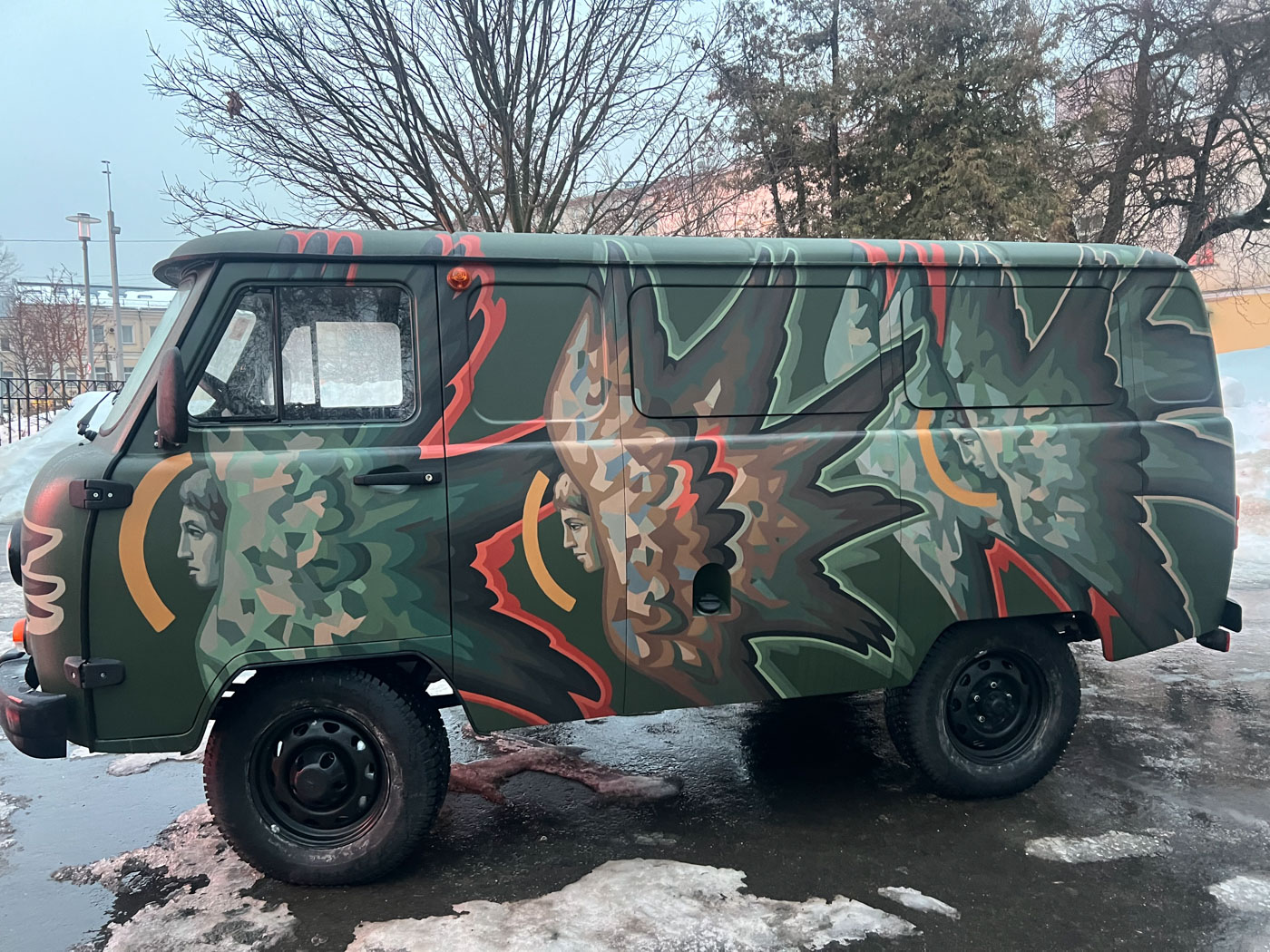 Выставка начинается еще на подступах к музею. На импровизированном «нуле», как военные называют границу боевых действий, или линию боевого соприкосновения (ЛБС), — посетителей встречает расписанная муралистом Александром Цыпковым «буханка». УАЗик сразу после закрытия выставки отправится на Донбасс, в Авдеевку, где его передадут храму для развоза гуманитарки.