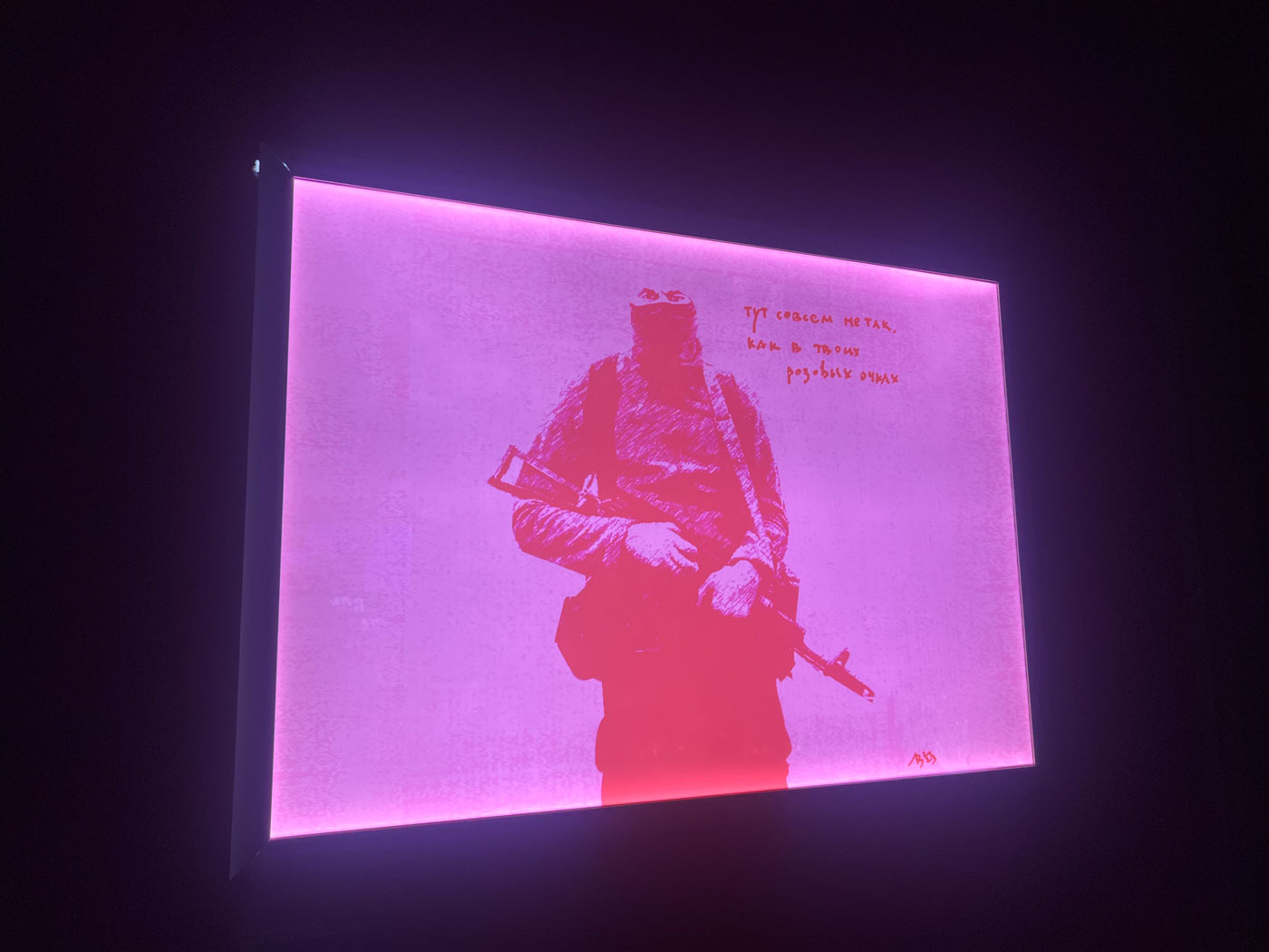 А здесь, в розовом тумане, черным оттиском запечатлен боец диверсионной группы. Его лицо закрыто армейским бафом. Рядом надпись: «тут все не так, как в твоих розовых очках».