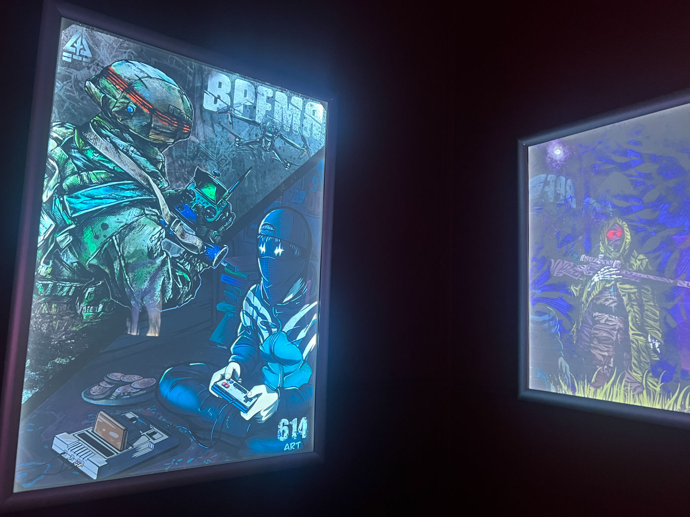 Сразу за «нулем» двери распахиваются. Лестница ведет в три темных зала, два из которых наполнены картинами. В первом зале нет живой фактуры масла, только холодная, но при этом задевающая до глубины души «цифра». Вот на полу сидит маленький мальчик, у него в руках пульт, а перед ним — приставка. Мальчик вырастает, и вот уже он уже в зоне боевых действий, все так же, с пультом в руках, но теперь управляет не компьютерными героями, а беспилотником.