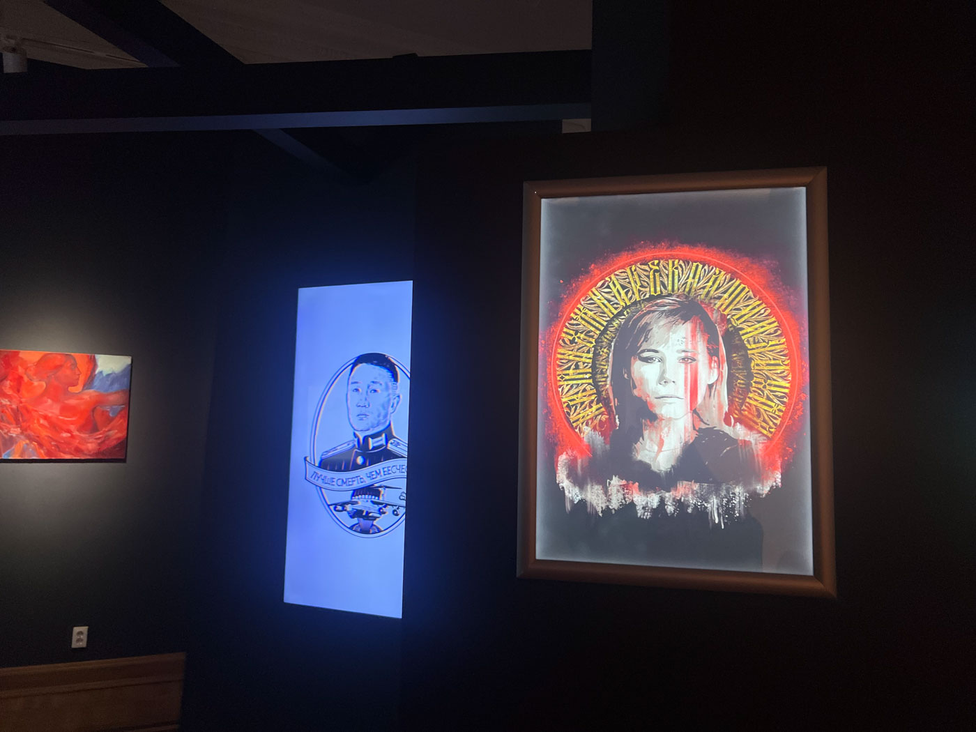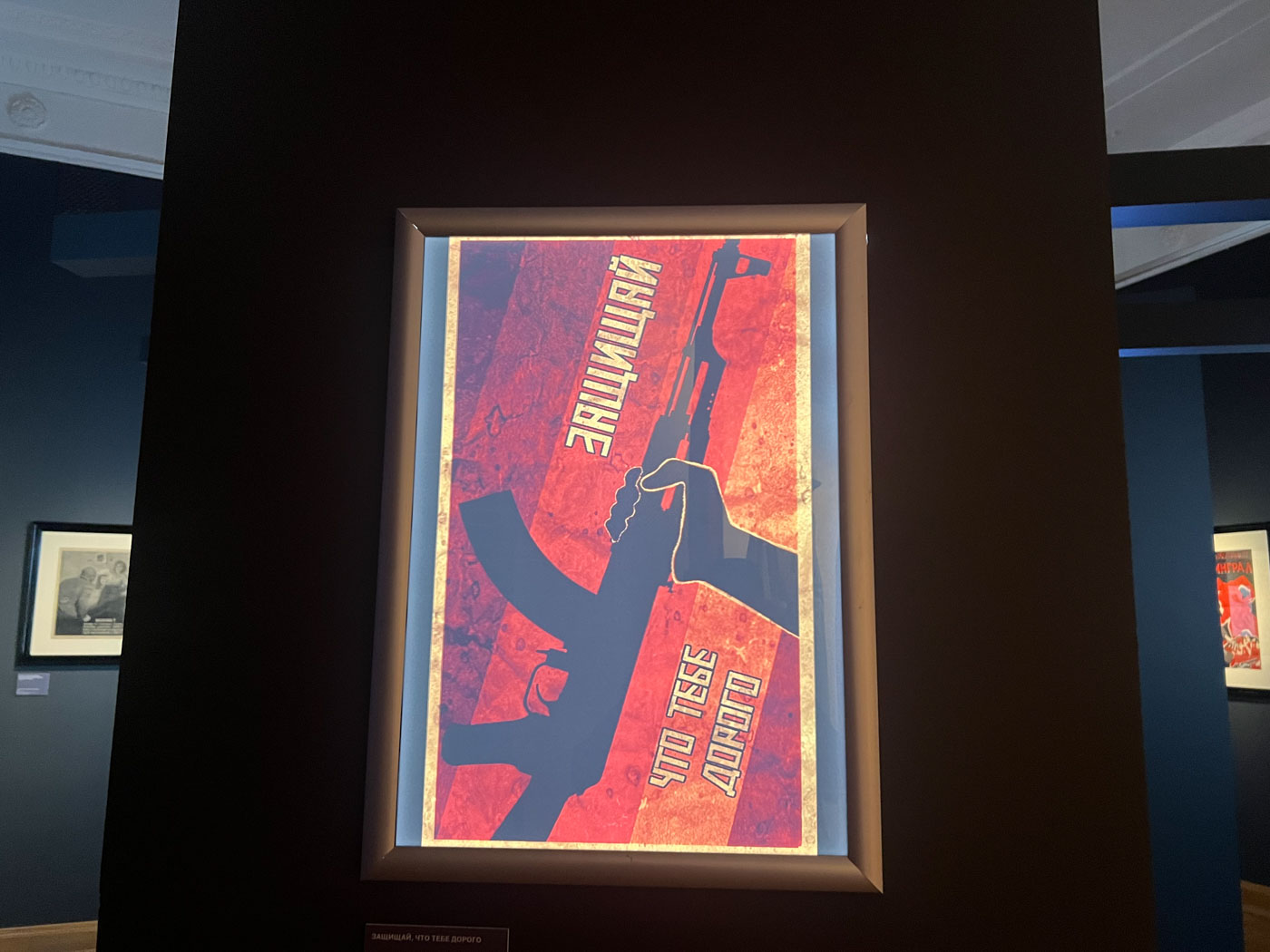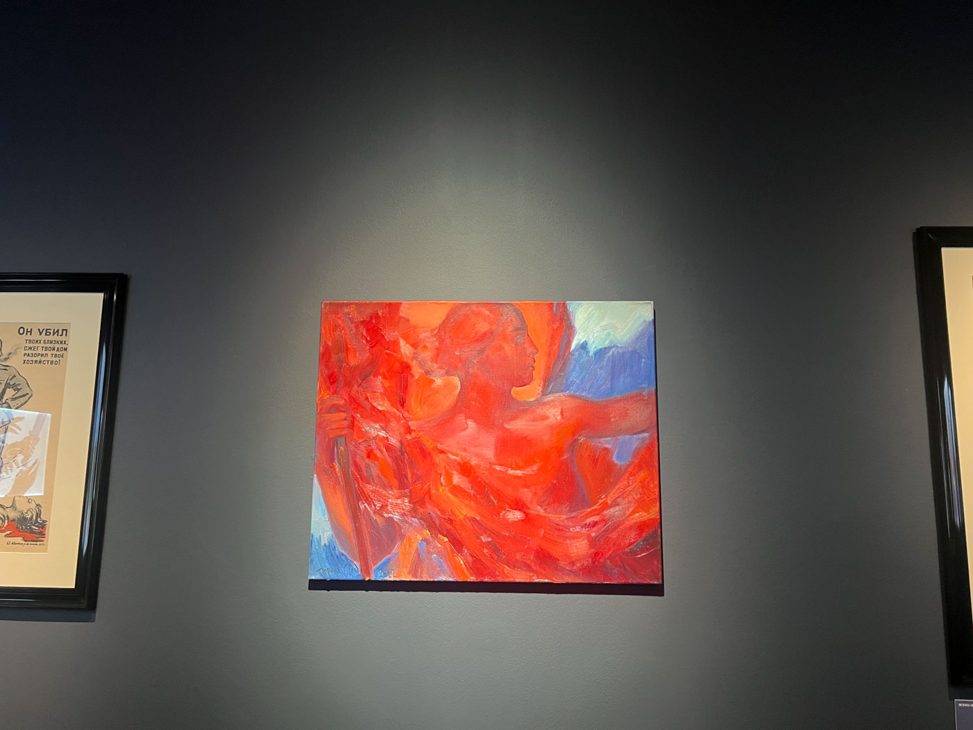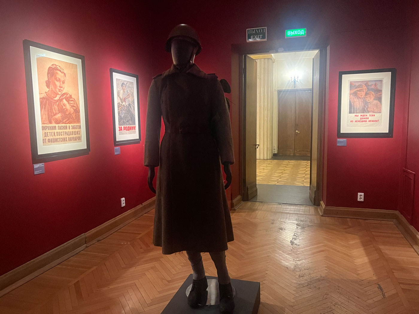 В серединном зале эта преемственность как будто витает в воздухе, кочует от первого ко второму, вибрирует в каждом стенде, рамочке, каждой стене. В этом зале советские агитплакаты перемежаются с современными картинами. Портреты воинов былых эпох на цифровом экране перемешиваются с лицами ополченцев, бойцов Русской весны и СВО.