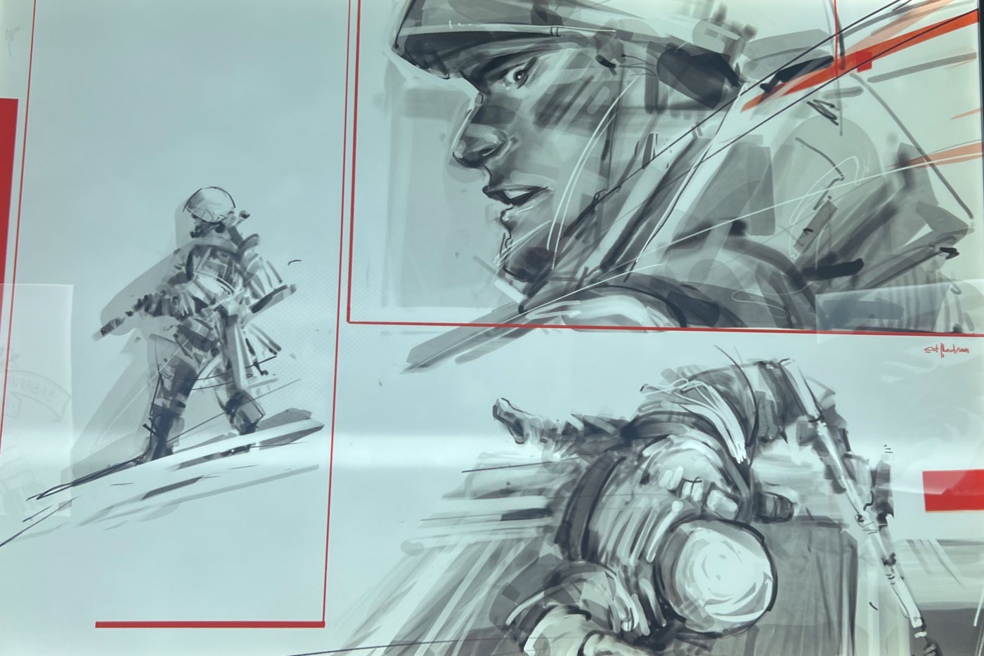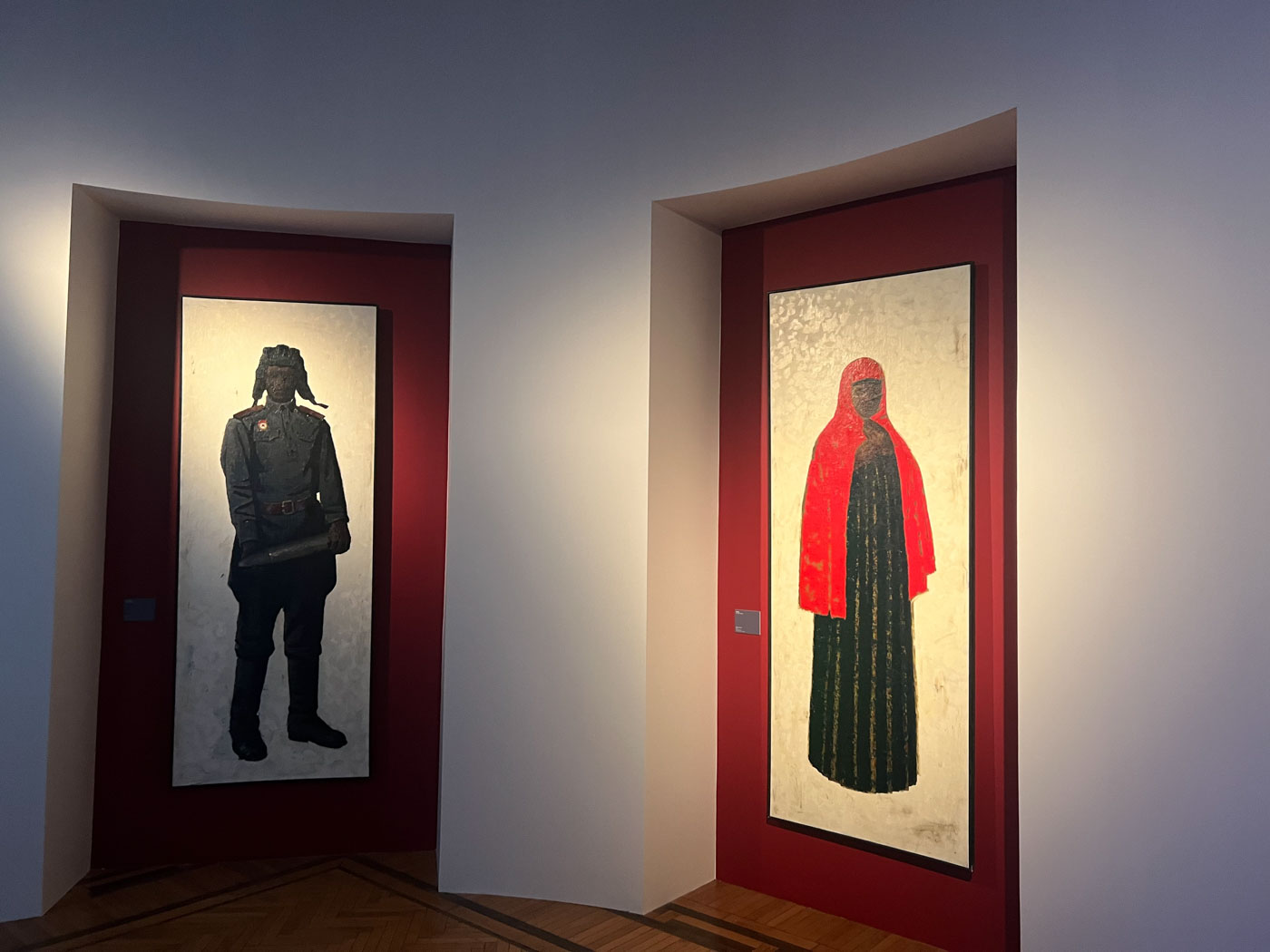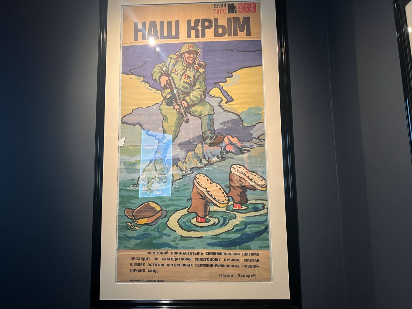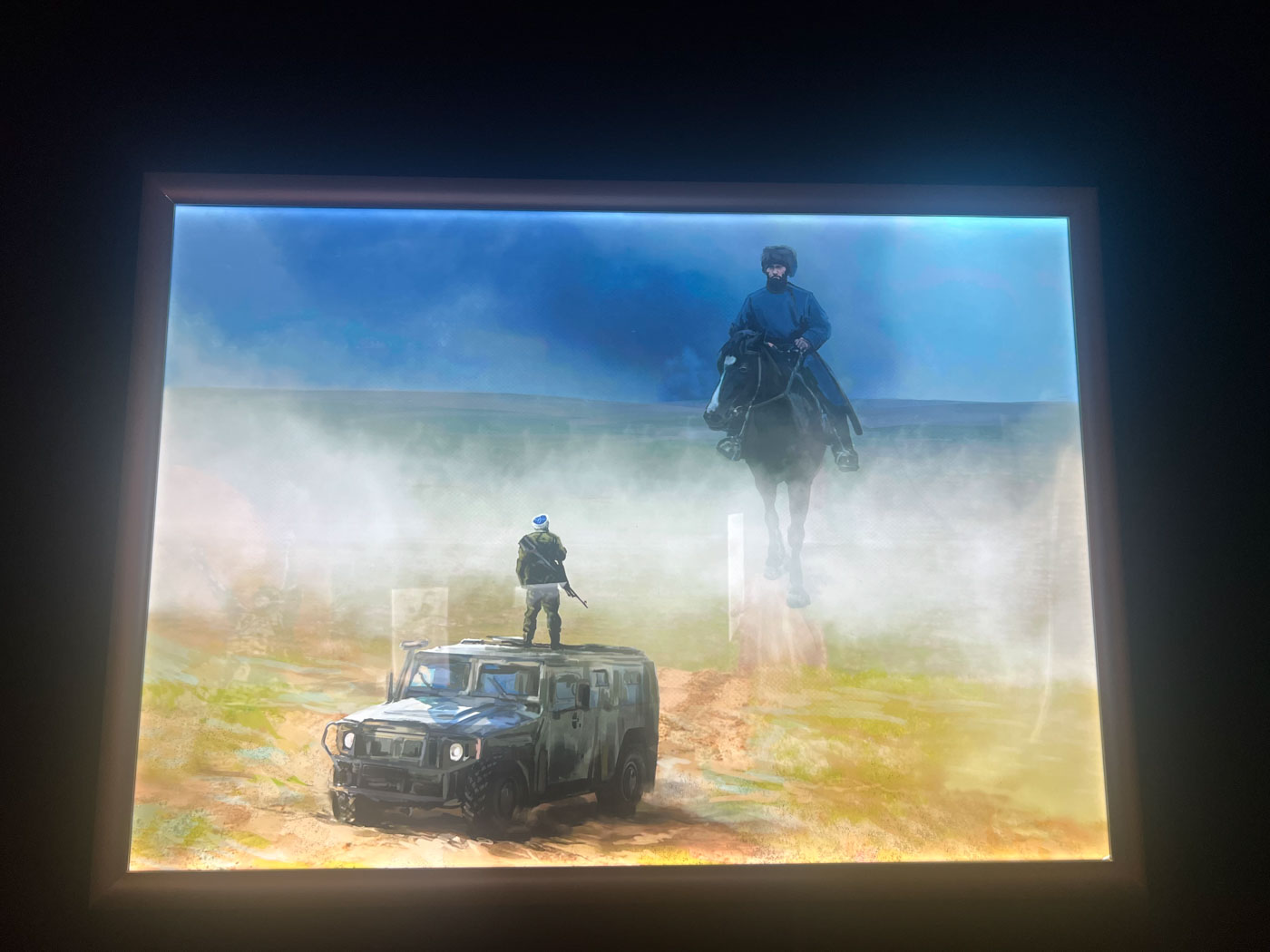 В серединном зале эта преемственность как будто витает в воздухе, кочует от первого ко второму, вибрирует в каждом стенде, рамочке, каждой стене. В этом зале советские агитплакаты перемежаются с современными картинами. Портреты воинов былых эпох на цифровом экране перемешиваются с лицами ополченцев, бойцов Русской весны и СВО.