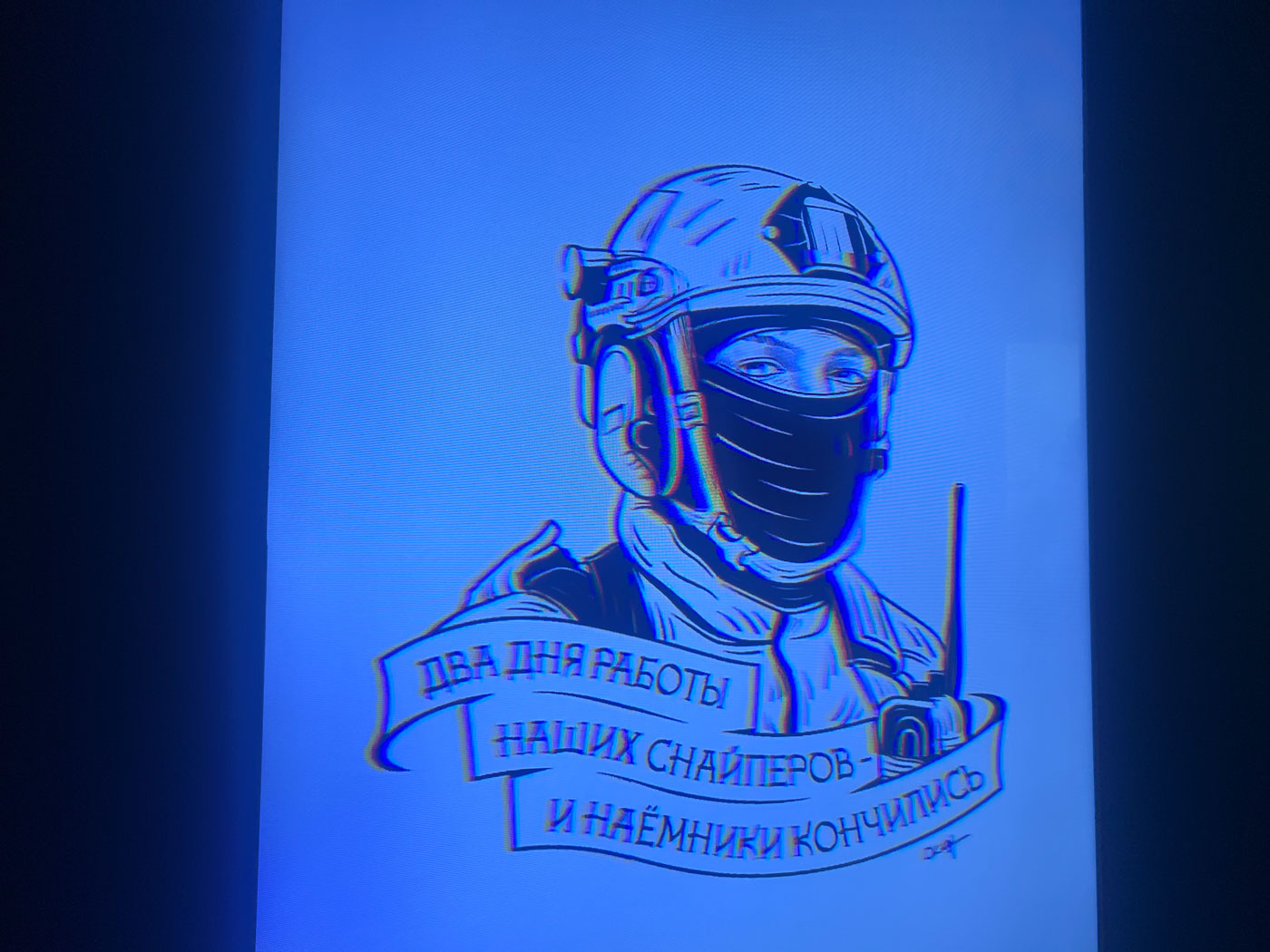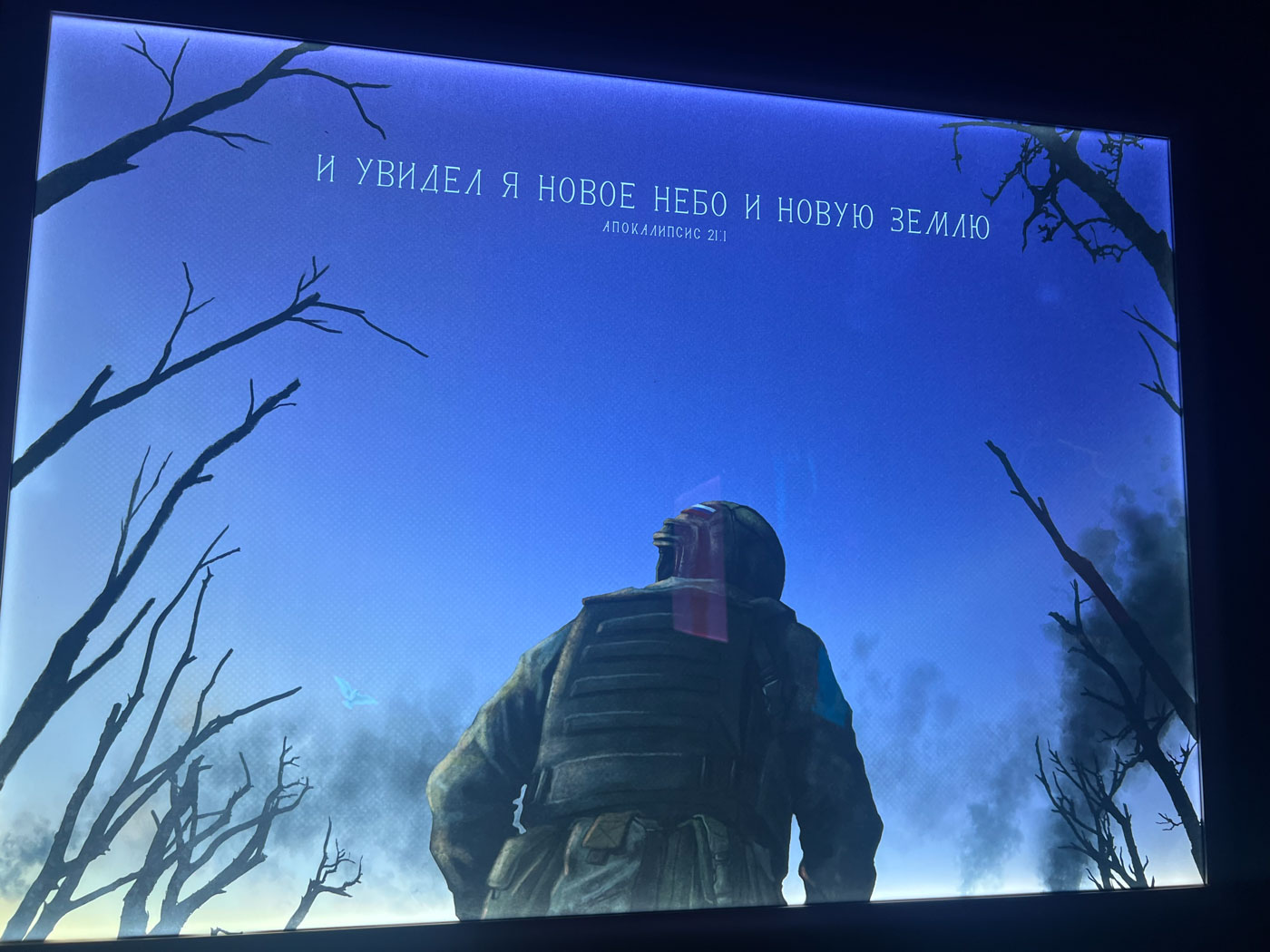 Есть в лабиринтах выставки и четвертый зал. В нем расположен большой экран, на котором чередой идут документалки об СВО. В этом зале расположена, пожалуй, центральная работа экспозиции, если не сказать больше — артефакт. В углу, над экраном, зал озаряет лик Спасителя. Это знаменитый «Окопный спас».