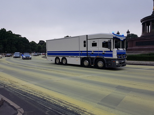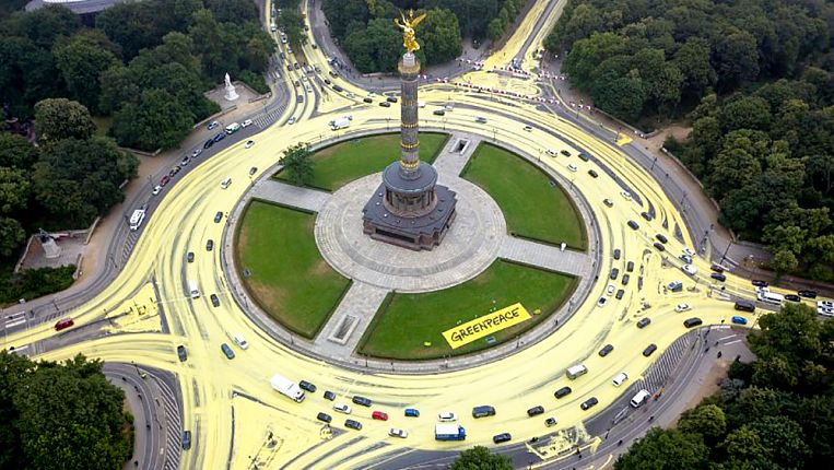 Активисты Greenpeace вылили на площадь вокруг берлинской Колонны Победы больше трех тысяч литров краски. Для этого использовали специально оснащенные грузовики, тележки с валиками и — непреднамеренно — немецких автовладельцев. Если смотреть сверху, то на месте привычного круга получалось гигантское солнце. И именно солнечной (и ветряной) энергетикой Greenpeace требует замещать угольные электростанции, приближающие глобальное потепление.