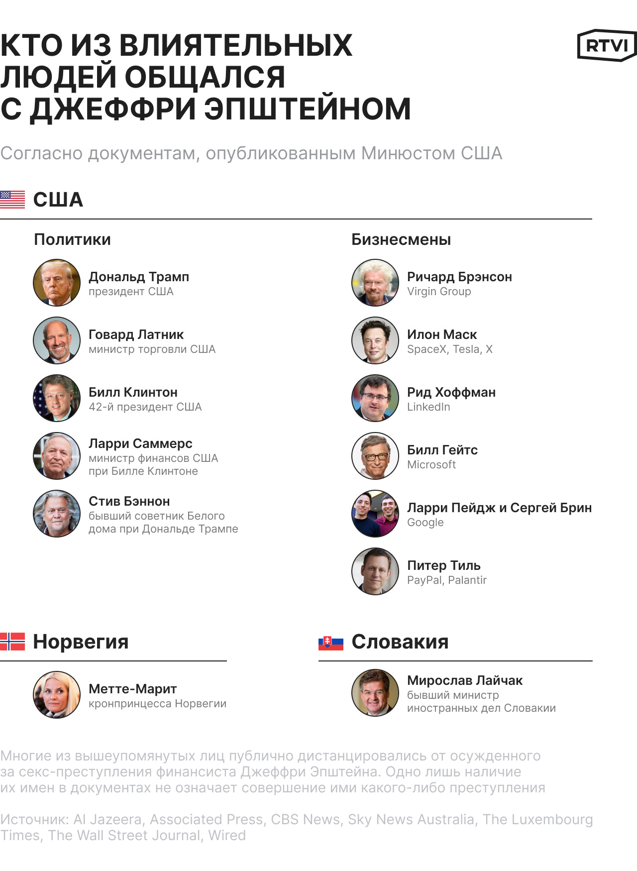 - Среди других известных американских бизнесменов в файлах Эпштейна так или иначе упоминаются основатель корпорации Virgin Group Ричард Брэнсон (позже он осудил секс-преступления Эпштейна), соучредитель Microsoft Билл Гейтс, сооснователи Google Ларри Пейдж и Сергей Брин, а также соучредитель PayPal и Palantir Питер Тиль.