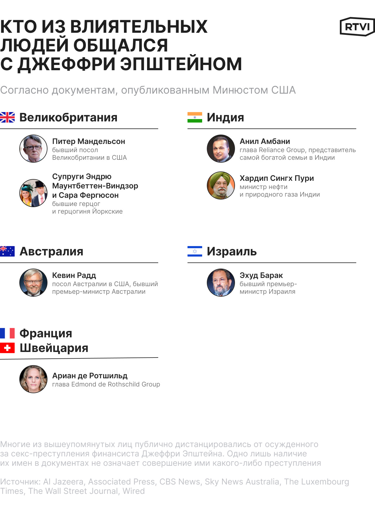 - В файлах Эпштейна фигурирует бывший премьер-министр Австралии Кевин Радд. Ныне посол страны в США, он отрицает какие-либо дружеские связи с финансистом.