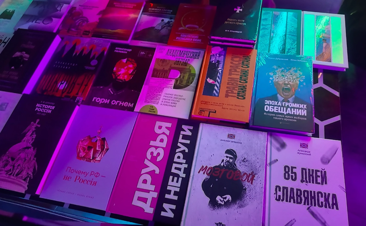 Справа от входа представители магазина «Листва» торгуют книгами издательства «Черная сотня», среди которых, например, мемуары участников СВО и «Русской весны», и уже отрываются вовсю под клубную музыку, звучащую из колонок. Покупателям сегодня предоставляется скидка 20%.
