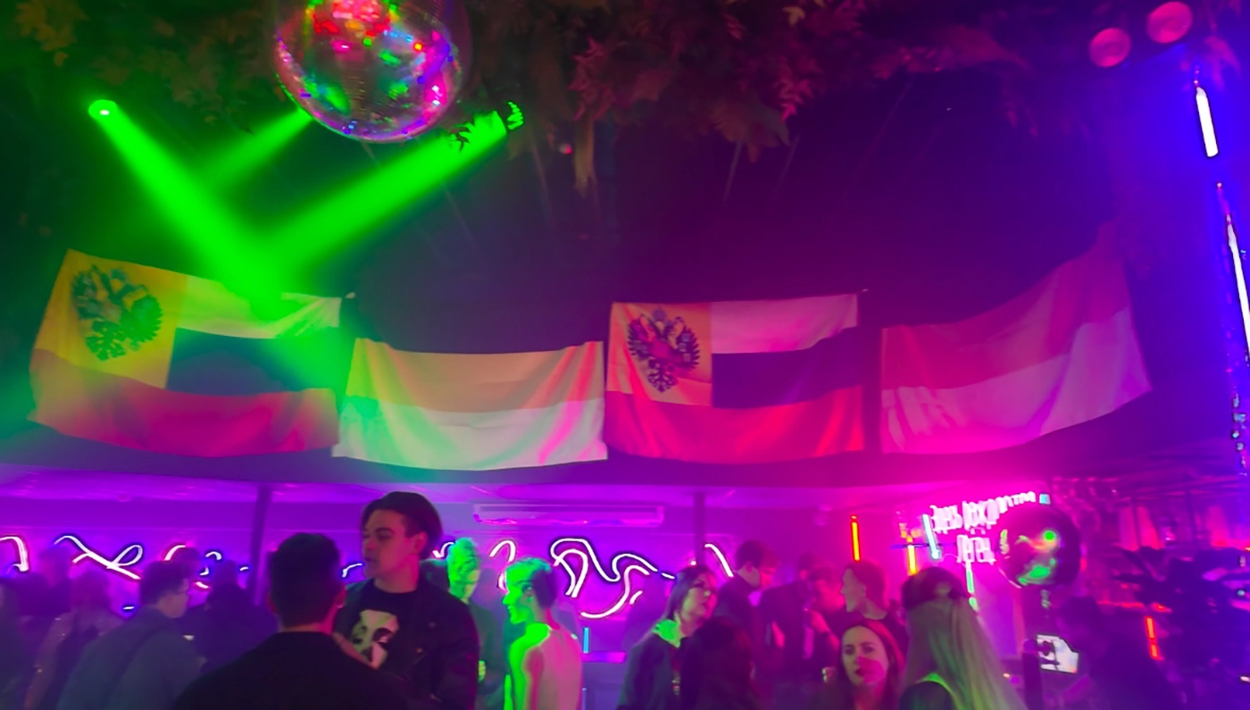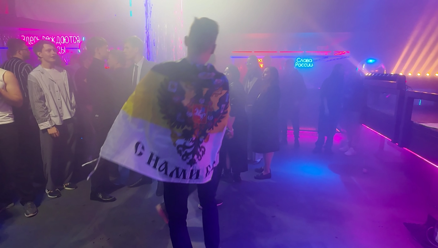 Русский Посвят начинается. На танцпол врываются первые ласточки. Парни лихо отплясывают под современный саунд. На плечах одного из них развивается черно-желто-белый флаг с имперским орлом. В это время бар продолжает заполняться.