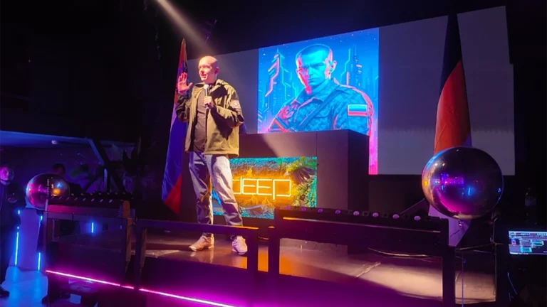 У входа собралась очередь из студентов. Всех серьезно досматривают люди в масках. У некоторых пришедших рюкзаки с имперками. На ком-то студенческая фуражка, которые носили курсисты в Российской империи. Есть тут и крепкие, брутального вида парни — участники СВО. Один из них — Евгений Рассказов, он же Топаз — бывший боец воюющего на стороне России ДШРГ «Русич», а ныне представитель добровольческой бригады «Эспаньола». Топаз — один из спикеров сегодняшнего вечера. На мероприятие, как и многие, он пришел в косоворотке.