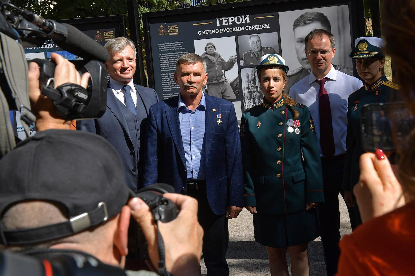 На церемонии открытия фотовыставки «Герои с вечно русским сердцем», созданной Российским военно-историческим обществом