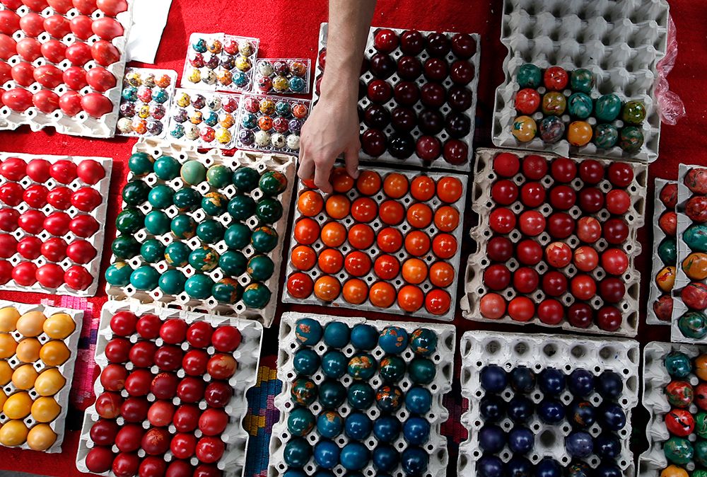 Покупатель выбирает раскрашенные пасхальные яйца на рынке в Белграде, Сербия Фотография: Darko Vojinovic / AP