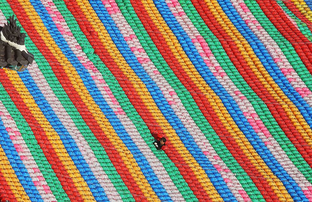Рабочий устанавливает цветные бумажные фонари в храме Чогеса, Сеул, в преддверии дня рождения Будды, которое будут отмечать 12 мая Фотография: Ahn Young-joon / AP