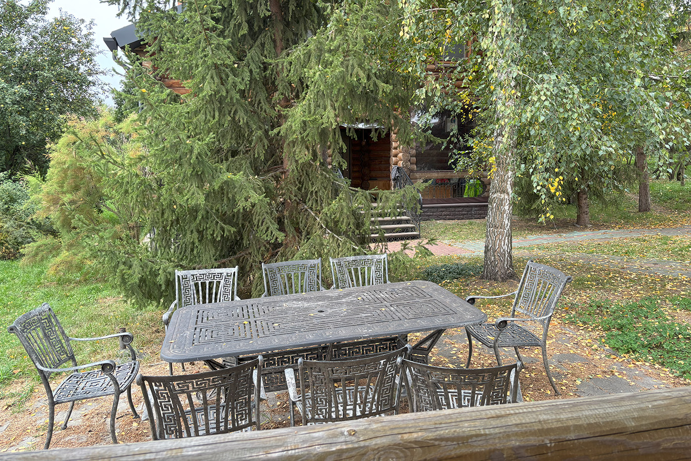 Домик стоит на возвышении, у крутого склона расположена костровая площадка и четыре деревянных кресла с видом на реку Воронеж и заповедник. Вокруг стоит тишина и умиротворение — Любовь объясняет, что на этом и основывается концепция отдыха, которую они задумывали.