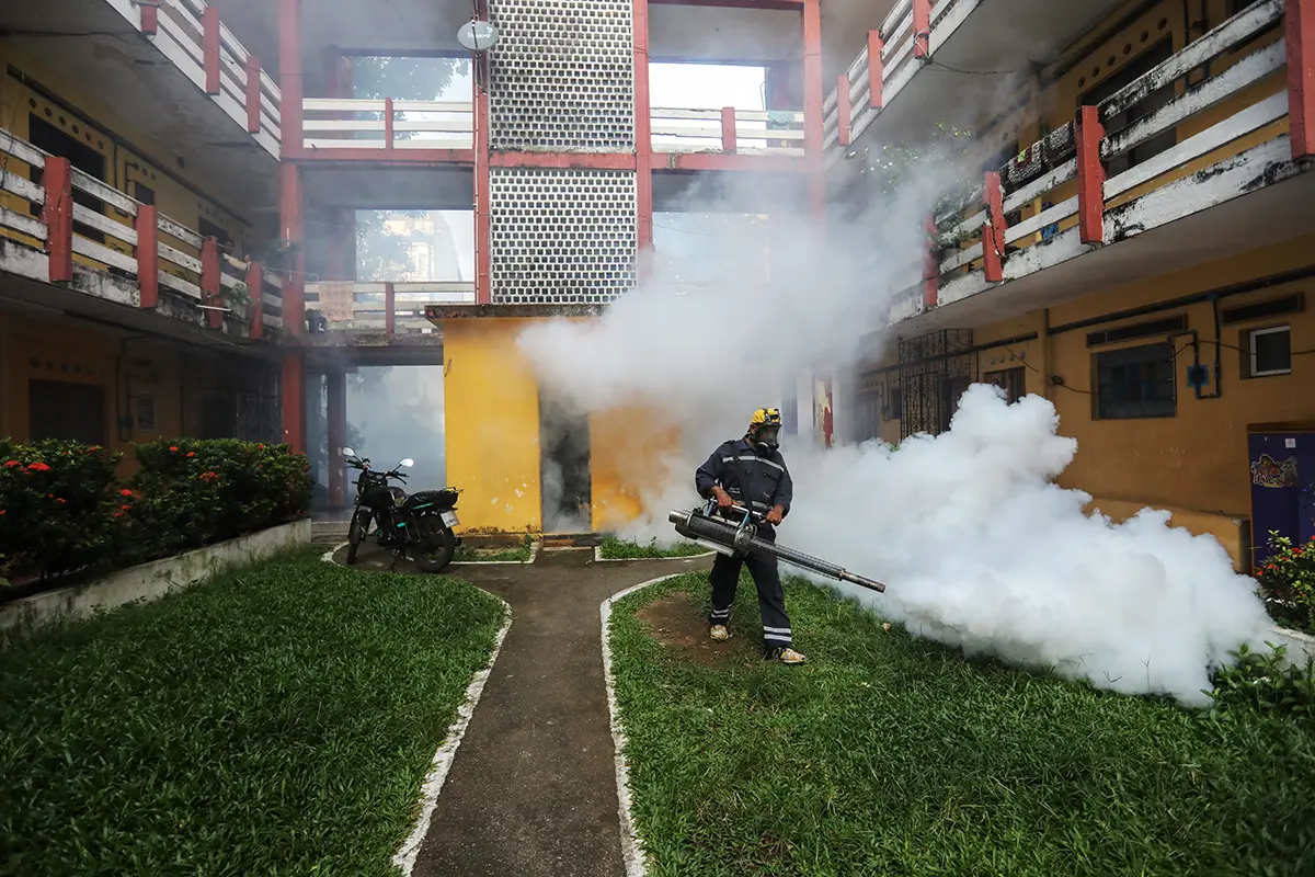 Медицинский работник проводит обработку инсектицидами против размножения комаров в попытке контролировать распространение лихорадок денге и чикунгунья в Коломбо. Шри-Ланка, 3 июля 2025 года