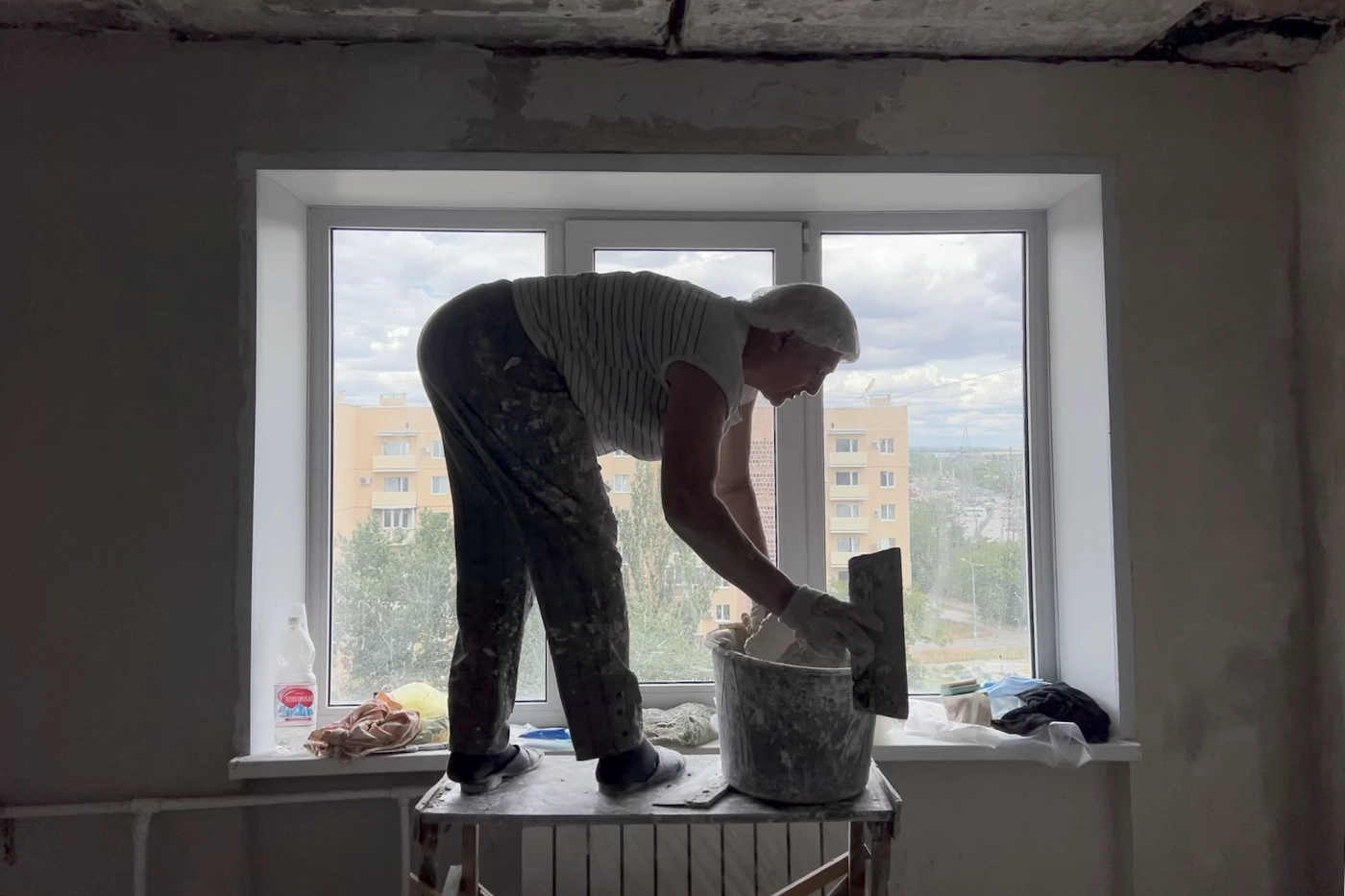 «Заполнила анкету и поехала сюда, чтобы не бездельничать. Цветы оставила на балконе в Москве. Думала, что на 10 дней поеду и никому не сказала, куда», — рассказывает женщина. В Москве Валентина работала банщицей, а теперь, в Мариуполе, она помогает штукатурить квартиру 76-летней пенсионерке.