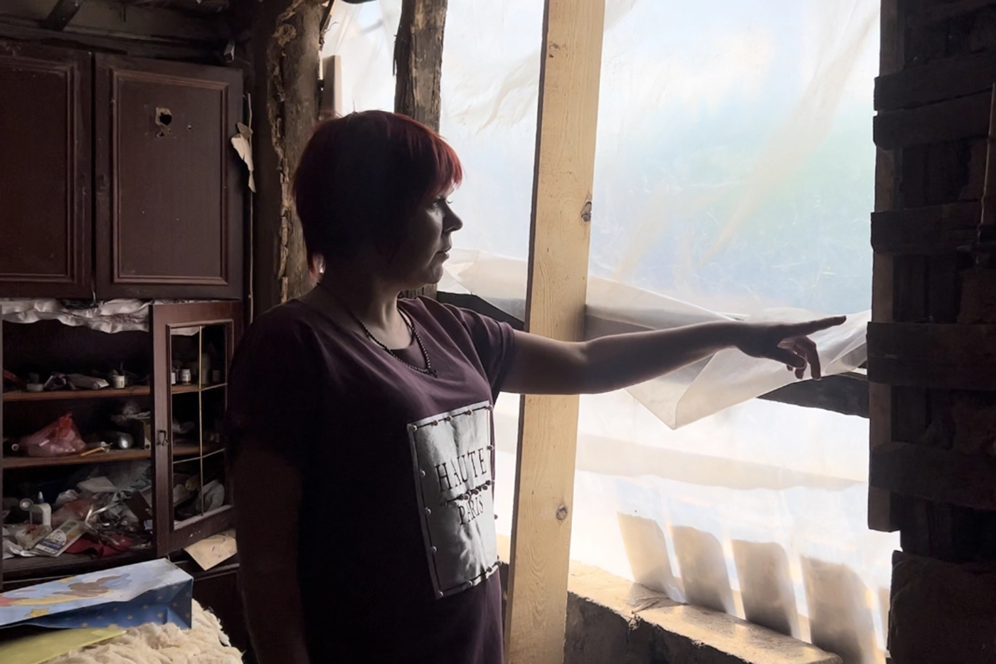 «Вот тут мы спали, а вся эта стена прилетела на нас. Я еще до этого убрала ножки у кровати и просто положила матрас. Как чувствовала. Если бы кровать выше была, то нас, наверное, уже бы не было», — рассказала женщина. Раньше она жила в Крыму, в Белогорске, но несколько лет назад, еще до начала боевых действий, продала недвижимость и переехала: «решила домой вернуться. И что я увидела? Ну, никто и не знал, что тут такое будет». Почти три года Елена не могла восстановить дом — компенсации за разрушенное жилье она не добилась, поэтому обратилась к волонтерам. О том, что Синодальный отдел по благотворительности РПЦ занимается помощью в ремонте разрушенных в результате боевых действий зданий Елена узнала случайно: в церкви. «Через две недели ребята приехали, теперь помогают мне крышу латать. Раньше она подтекала, я ее сама заделывала», — рассказала женщина, указывая рукой на свежие балки.