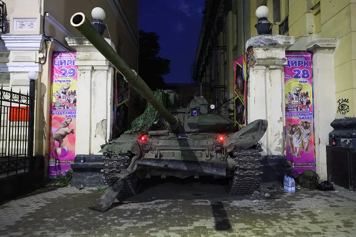 Танк бойцов ЧВК «Вагнер» у здания Южного военного округа в Ростов-на-Дону, 25 июня 2023 года
