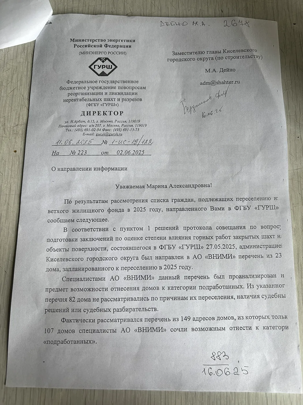 “Мы переехать надеялись уже в этом году. А оказалось, что мы считаемся не подработанными территориями. А какие не подработанные, когда разрез от нас уже в нескольких метрах?” — говорит Ольга Богдановна, мама Александра Селиверстова. Совсем недавно им в очередной раз пришел ответ из киселевского управления городского развития: “основания для переселения не установлены”. Такое решение приняли в ФГБУ “ГУРШ”, подведомственном министерству энергетики. Эта структура на федеральном уровне занимается вопросами реорганизации и ликвидации нерентабельных шахт и разрезов и помогает расселять людей с подработанных территорий — тех, где грунт деформируется в результате горных работ.