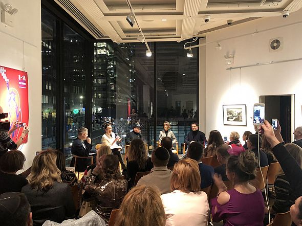 Круглый стол проходил в зале аукционного дома Bonhams, модераторами дискуссии стали главный редактор RTVI Алексей Пивоваров и заместитель главного редактора Екатерина Котрикадзе.