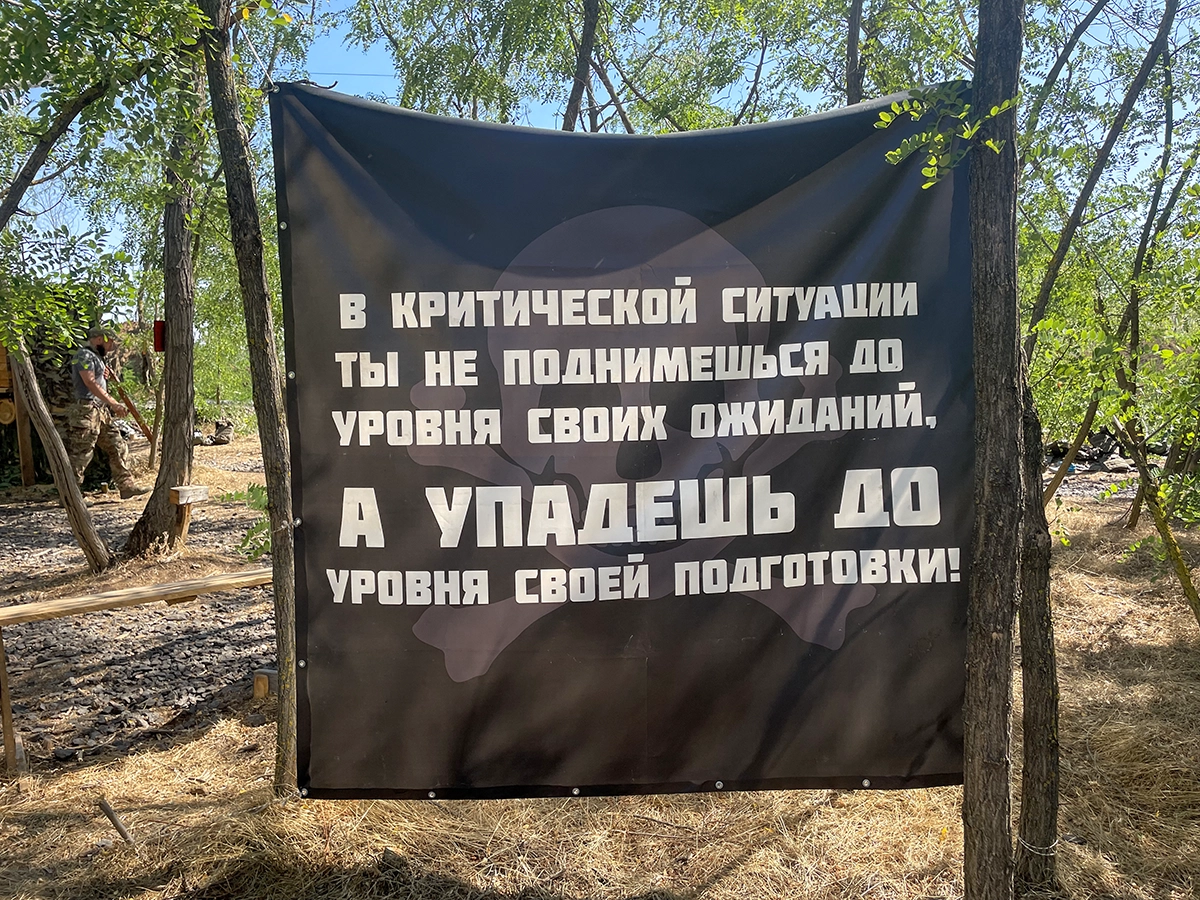 На одной из локаций парней учат работать боевыми двойками-тройками в условиях леса и лесополок. Это важно, потому что сейчас на передке приходится штурмовать много опорников. Тут отрабатывается правильность движений, постоянное подавление огнем, инструкторы смотрят, чтобы у новобранцев не было никаких затыков. На второй локации, так называемом Kill House, есть стены, здания и все то, с чем приходится иметь дело бойцам при работе в городских условиях. Также на территории лагеря есть класс, где проходят теоретические занятия, блиндажи — в которых спят «курсанты», столовая, лобное место и много других вещей, необходимых в процессе подготовки.