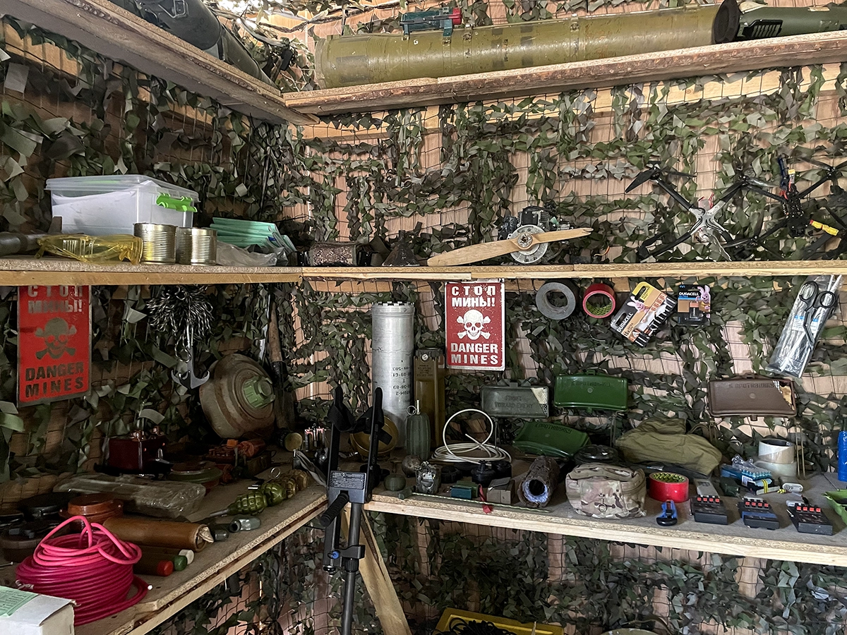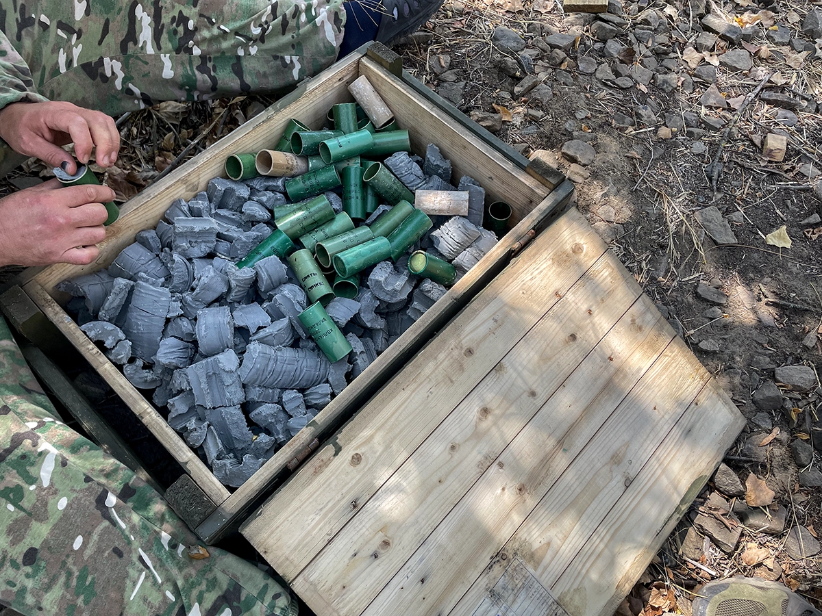 «Практически со всеми минами, с которыми сталкиваемся [на передке], мы здесь с ними работаем. Если, например, речь о фугасной мине, нагружаем ящик — кидаем. Чтобы люди видели, что будет. Не для того, чтобы застращать их, а показать, что происходит, чтобы они опасались неправильных действий», — объясняет Пепел.